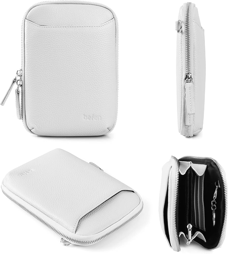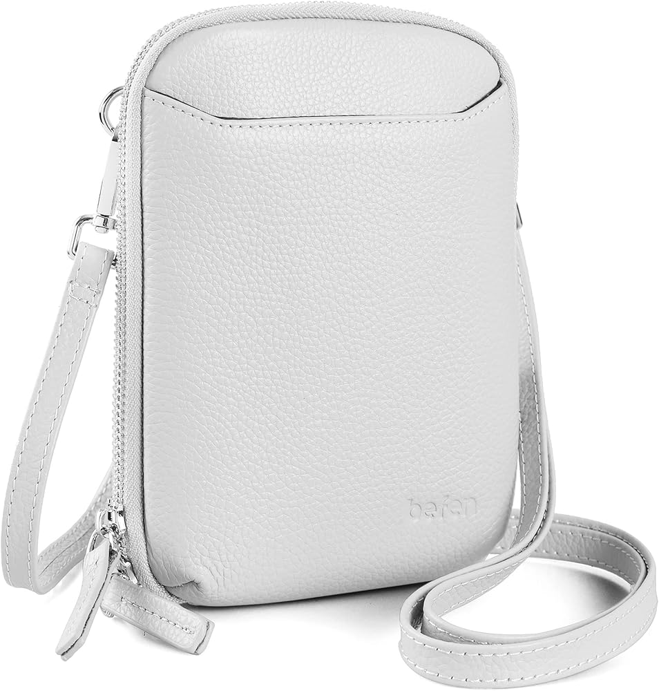 Check befen's latest cell phone crossbody bags! This cute purse features a front slip pocket for you to have quick access to your cell phone. With 2-way zip around closure and interior gusset pocket, this small cross body bag has a wide opening for you to take your stuff out easily while on the go. Material: Made of pebble pattern genuine leather, black fabric lining, silver tone metal hardware and zipper.