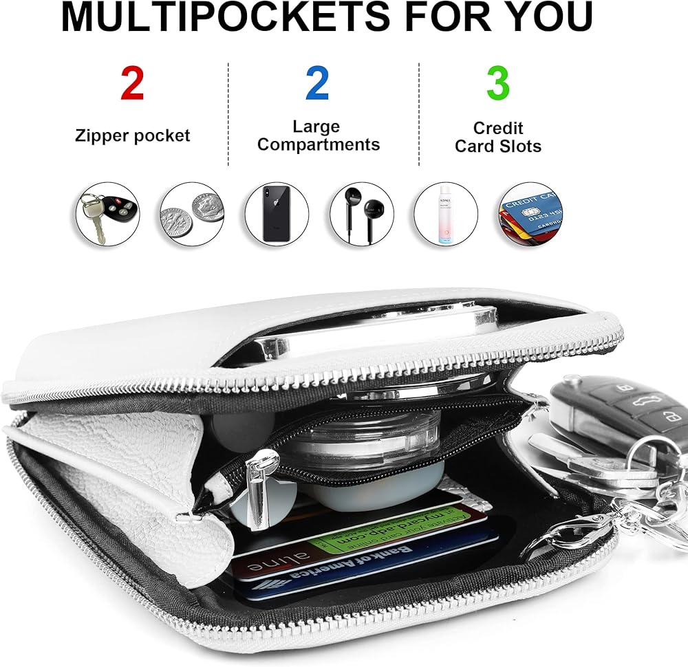 STRUCTURE: Outside: A front slip pocket for cell phone. Inside: 2 pockets for the essentials, a middle divider zipped pocket, 3 card slots and 1 keychain. It has enough space to help organize your cards, cellphone, lipsticks, sunglasses, keys and other small essentials.