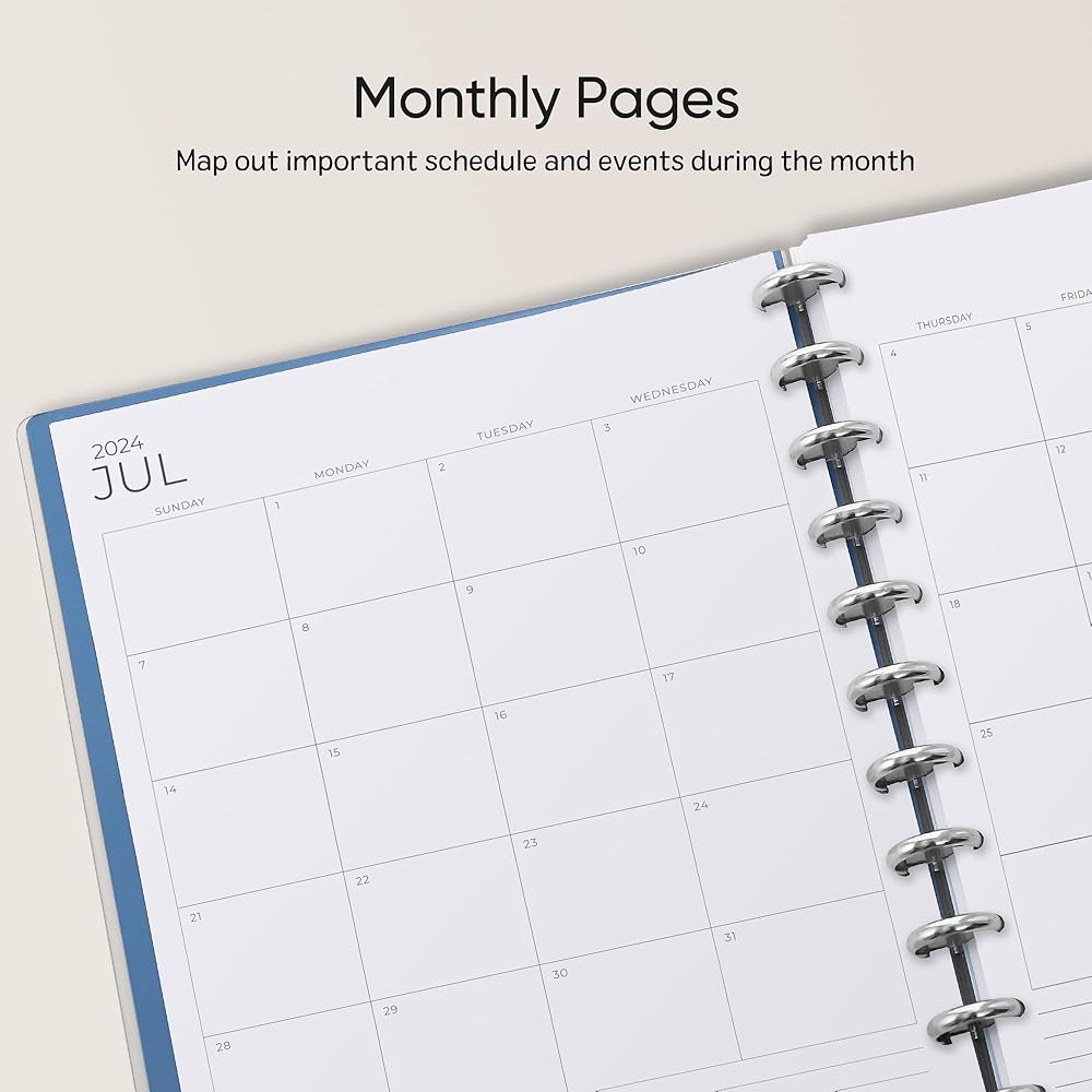 نظرة عامة شهرية: تحتوي الصفحات الشهرية للمخطط 2024-2025 على مساحة كبيرة للكتابة، وتحتوي على تقويمات مرجعية للشهر السابق والقادم على الجانب الأيمن من المخطط، وقسم ملاحظات للتخطيط الإضافي، وعلامات تبويب شهرية للتنقل السريع