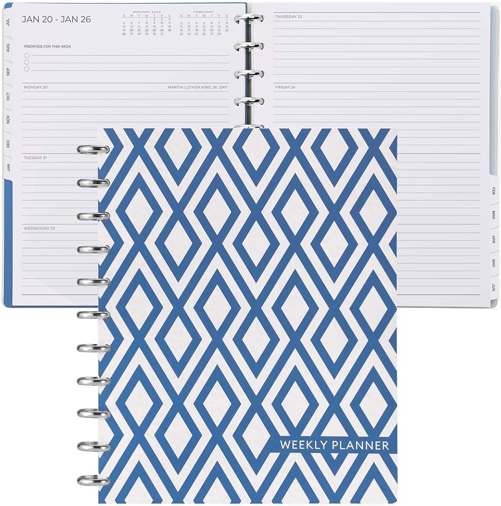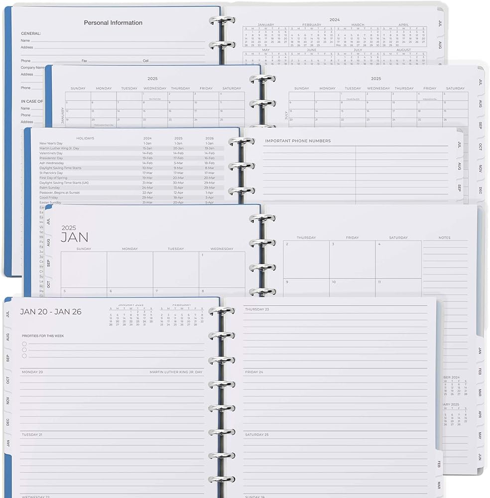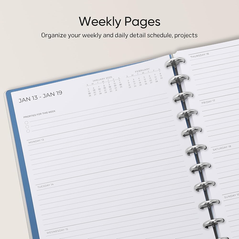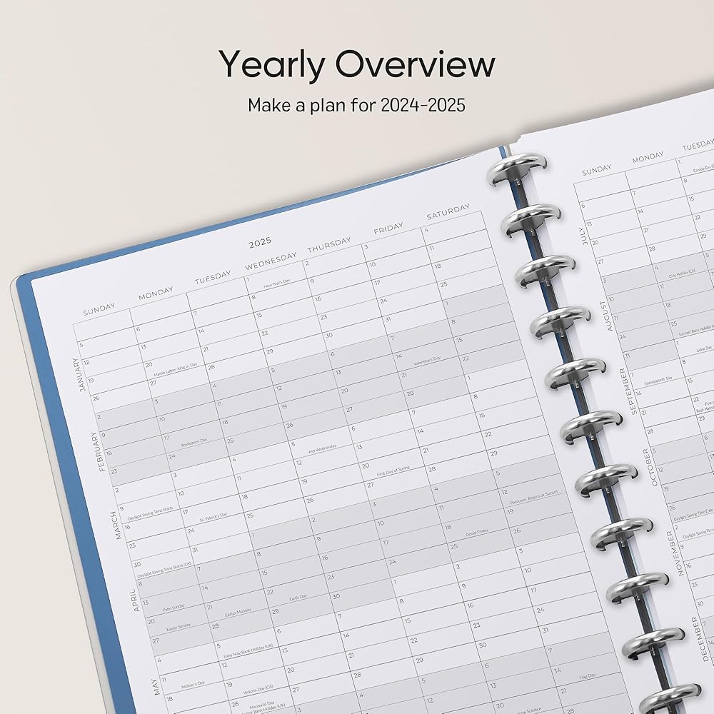 مخطط وظيفي: يتضمن مخطط Cabbrix الأسبوعي 2024-2025 قائمة بالعطلات الرئيسية لهذا العام، والتقويمات المرجعية السنوية 2024-2026، وصفحة تحديد الأهداف السنوية 2024-2025، وصفحات جهات الاتصال، و7 صفحات ملاحظات، وجيوب تخزين داخلية