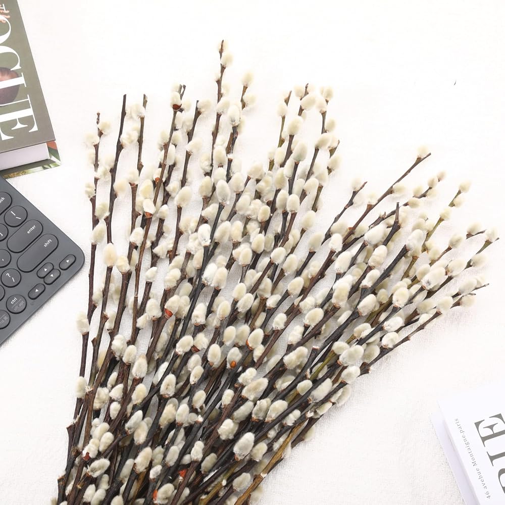 فروع الصفصاف الطبيعية: أغصان الصفصاف المجففة المحفوظة مع الزهور البيضاء مصنوعة من نباتات طبيعية حقيقية باستخدام تقنيات حفظ خاصة، مع الحفاظ على مظهرها الأصلي وجمالها الطبيعي الخالد. تحتوي كل عبوة على حوالي 20 سيقان وطول حوالي 43.18 سم (بدون مزهرية). تختلف الفروع الطبيعية في الحجم والطول، وكل قطعة فريدة من نوعها