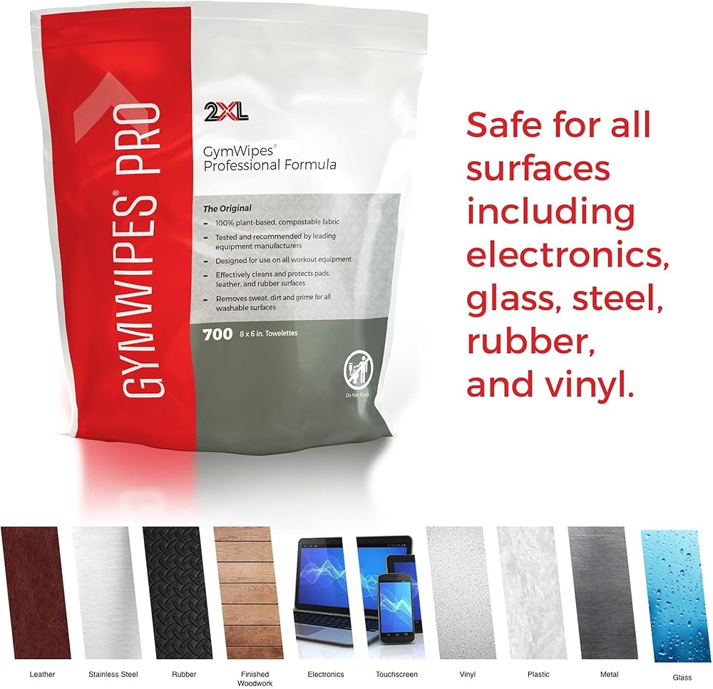 GymWipes Professional Towelettes are specially formulated for workout surfaces. Proven, reliable, nonalcohol-based formula dries fast and easily cleans all kinds of surfaces. It is safe on vinyl, leather, chrome, foam grips, rubber, painted surfaces, metal and even electronic displays. Wipes are alcohol-free, bleach-free and phenol-free.