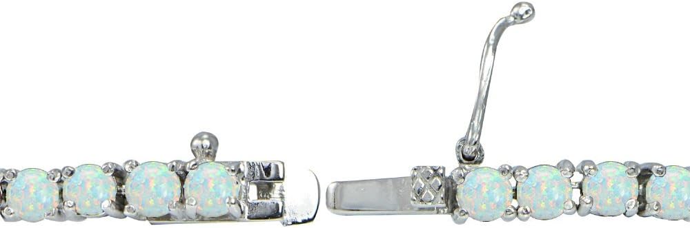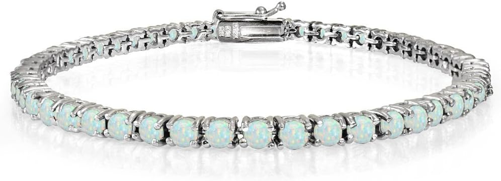 This gorgeous tennis bracelet features glistening 3mm genuine or created gemstones. Each stone is set in a four prong basket setting. The bracelet is crafted entirely of sterling silver and is secured by a box tongue and safety latch.