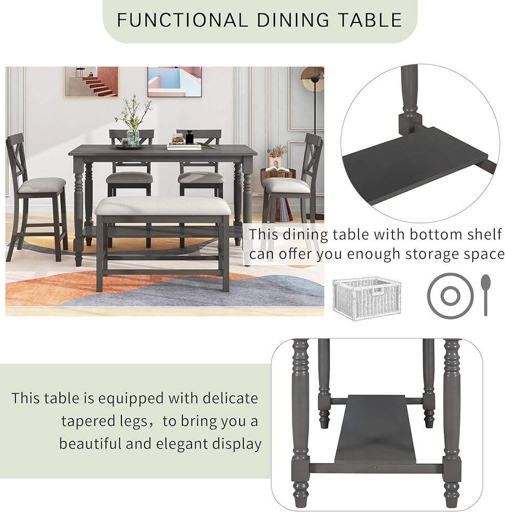 Elegant Appearance: The 6-piece counter height dining set consists of a table, four chairs and a bench. The multifunctional table is designed to fit in any space, and its classic, elegant design creates timeless appeal. Perfect to gather around, this essential table complements any room Decor.