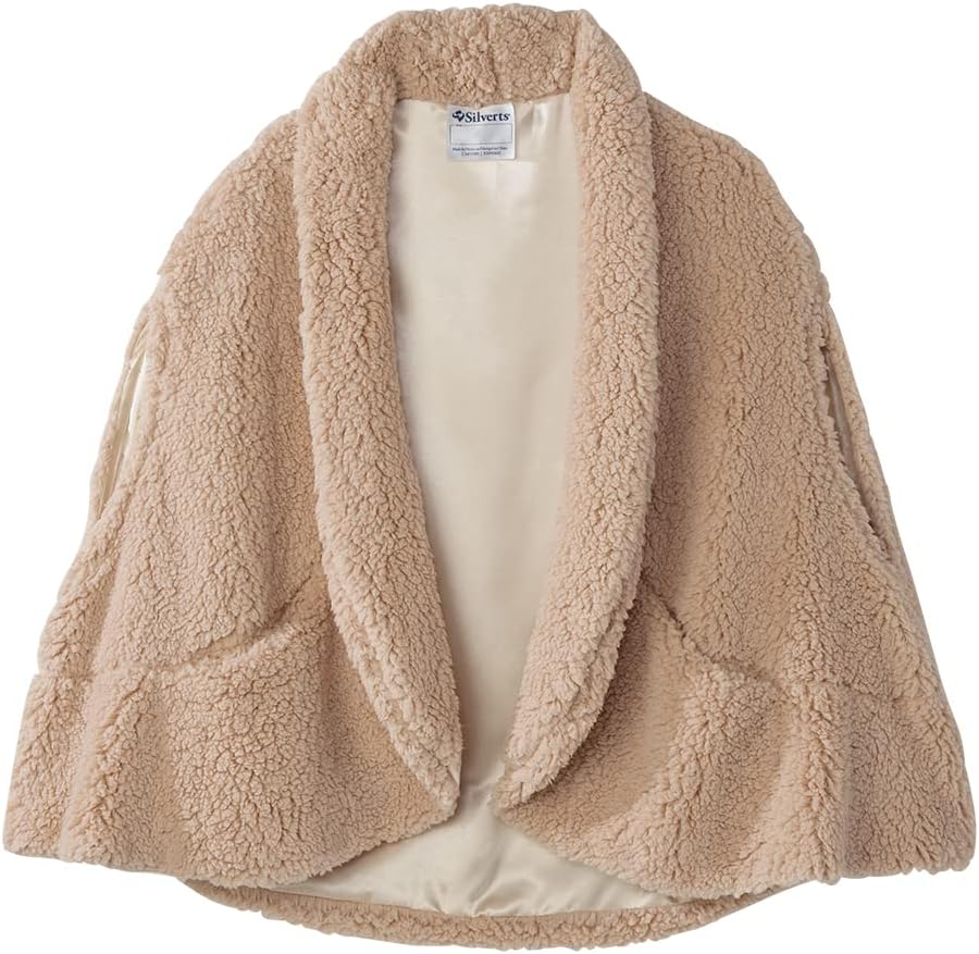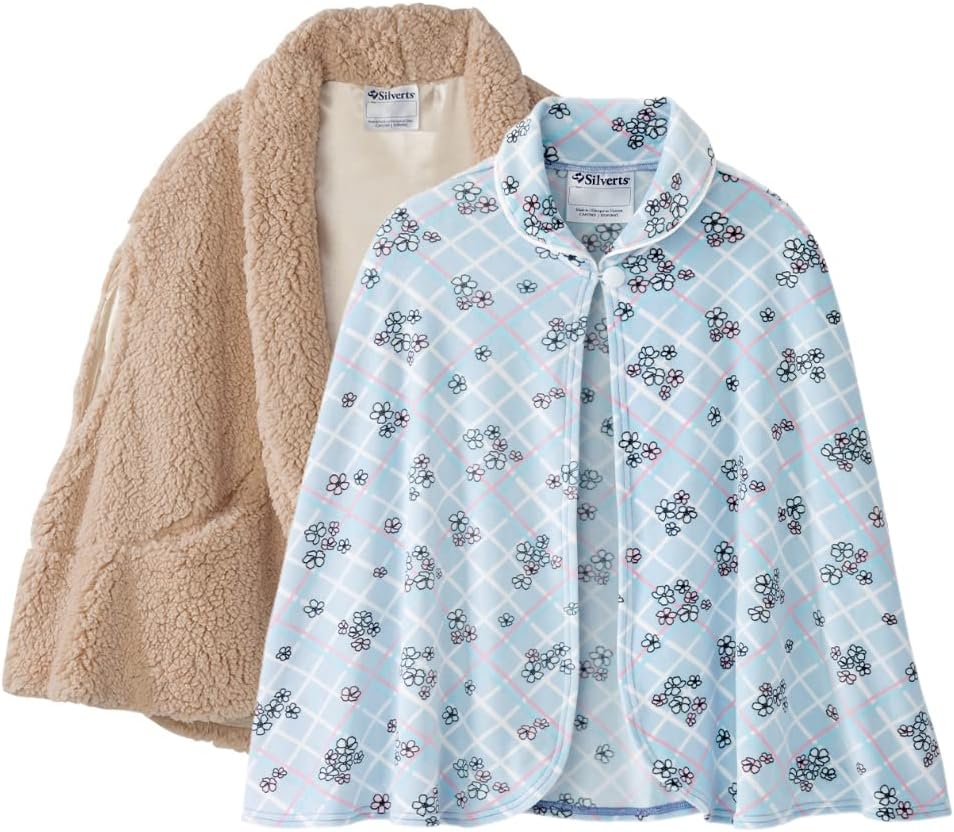 BED JACKET CAPE: Womens Bed Jacket Capes, beautifully designed to hug your shoulders with warmth. Fastens with a stylish button. Quality Polar Fleece Womens Bed Jackets. This fleece bedjacket capes for women is terrific for lounging in bed and a great alternative to robes. Makes a great gift addition for those wearing a cotton or flannel open back nightgown or regular nightgown for women. These capes for women are great for extra warmth for bedridden patients, a bed bound patient, rehabilitation care, skilled nursing facility, nursing care, home care and upper arm paralysis. This womens bed jacket capes by Silverts is a great sleepwear addition to anyone's wardrobe and accessories. SHAWL: Senior Women's Ultra Plush Shawl makes a warm and wonderful gift for your loved one. This shawl is a great stylish alternative to cardigans whether inside or outside. This shawl is Ideal for those with limited arm dexterity and features two convenient pockets to store your belongings. This shawl is made of a super plush sherpa fabric with a delicate satin lining for a touch of luxury.