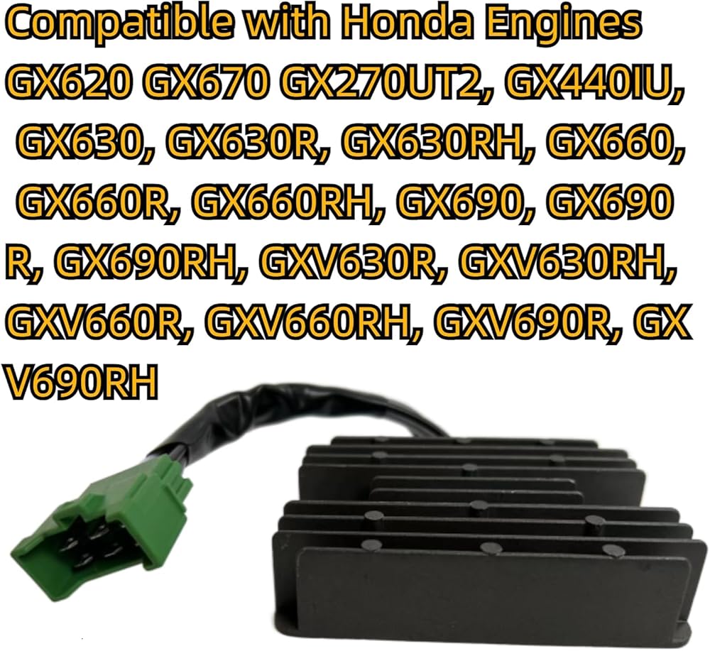 التوافق - يتوافق منظم الجهد الكهربي مع سرج الأسلاك مع محركات Honda GX270، GX440، GX610، GX620، GX630، GX630R، GX630RH، GX640، GX660، GX660R، GX660RH، GX670، GX690، GX690R، GX690RH.