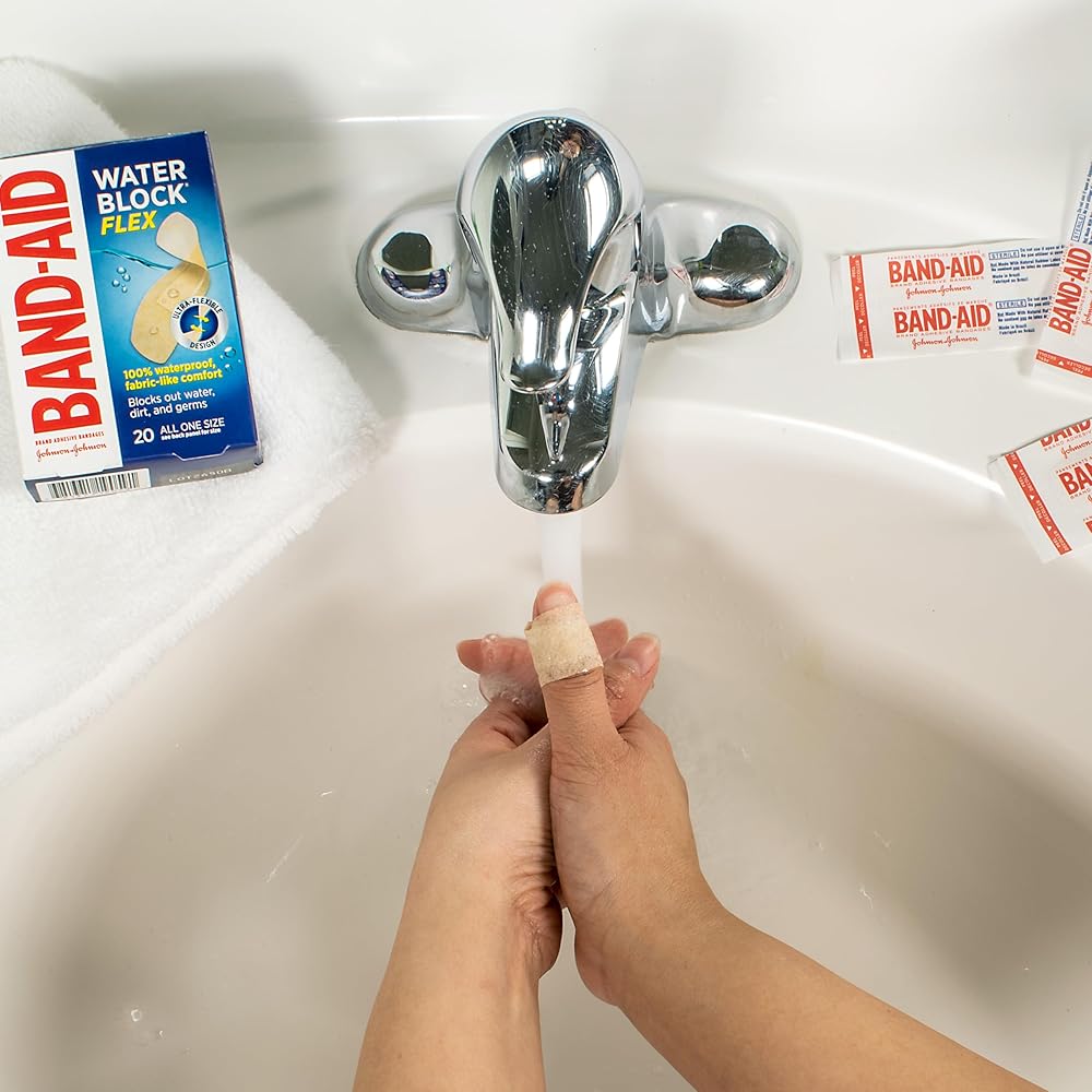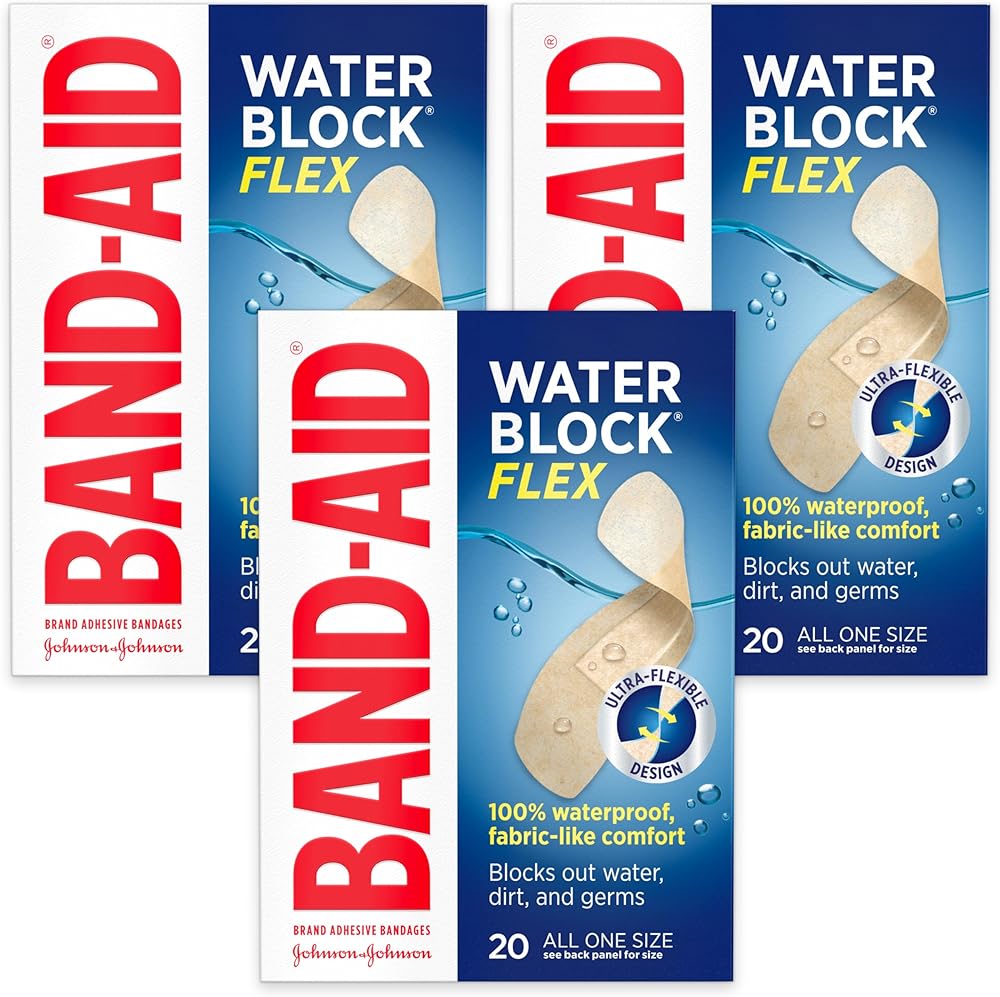• 6-count box of large 100% waterproof Band-Aid Brand Water Block Flex Adhesive Pads to cover larger minor cuts, scrapes & wounds and block out water, dirt, and germs that may cause infection