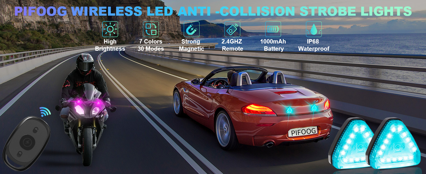 PIFOOG أضواء LED ستروب لاسلكية مع جهاز تحكم عن بعد مضاد للتصادمات، سطوع عالي، مغناطيسي قابل لإعادة الشحن، 7 ألوان، مصباح وامض للسيارة والدراجات النارية والشاحنات والدراجات الليلية، ضوء تحذير للطوارئ قطعتان