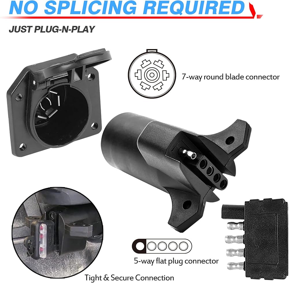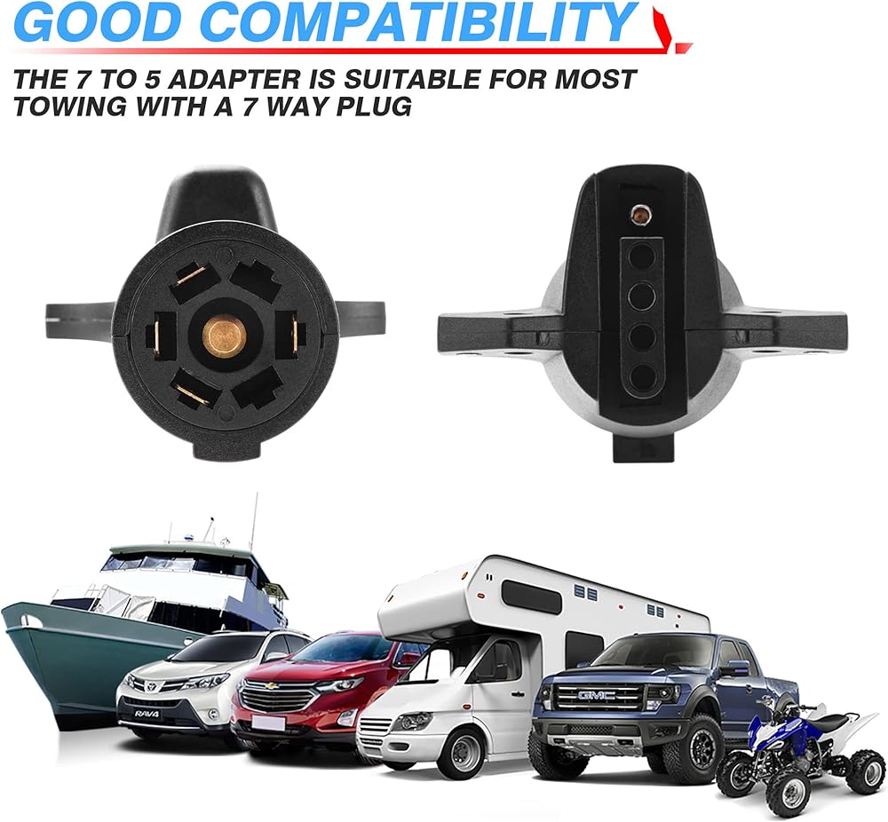 • توافق رائع - قابس محول المقطورة هذا من 7 إلى 5 اتجاهات يناسب قابس المصنع 7 اتجاهات في معظم الشاحنات مع حزمة السحب، مناسب للقوارب أو RV أو ATV أو شيفروليه أو فورد أو دودج أو رام أو تويوتا أو جي إم سي