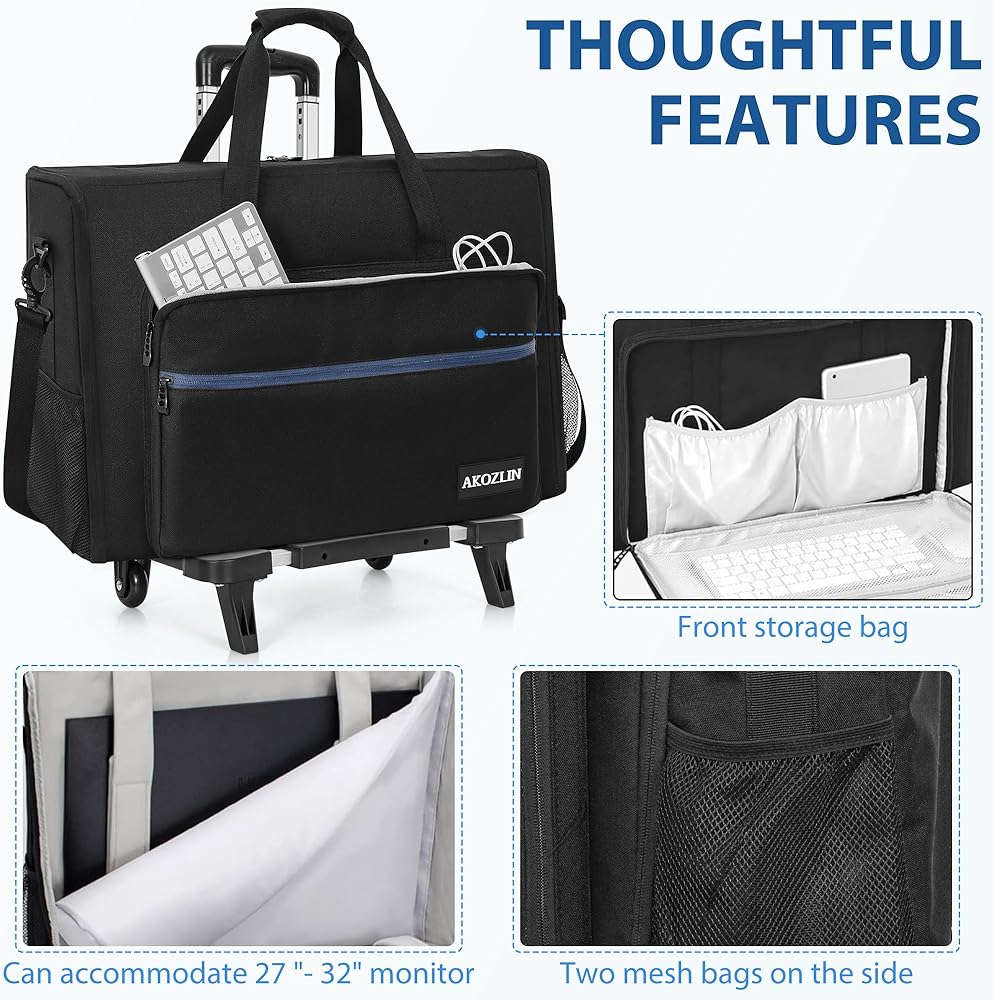 【Detachable Compartment】AKOZLIN Bag fits two screens 27"-32" with adjustable padded divider, Four adjustable padded belts can stabilize the screen and reduce shaking. It also can be used for single monitor with base attached(the width of base≤6")