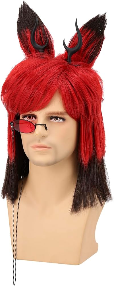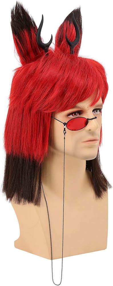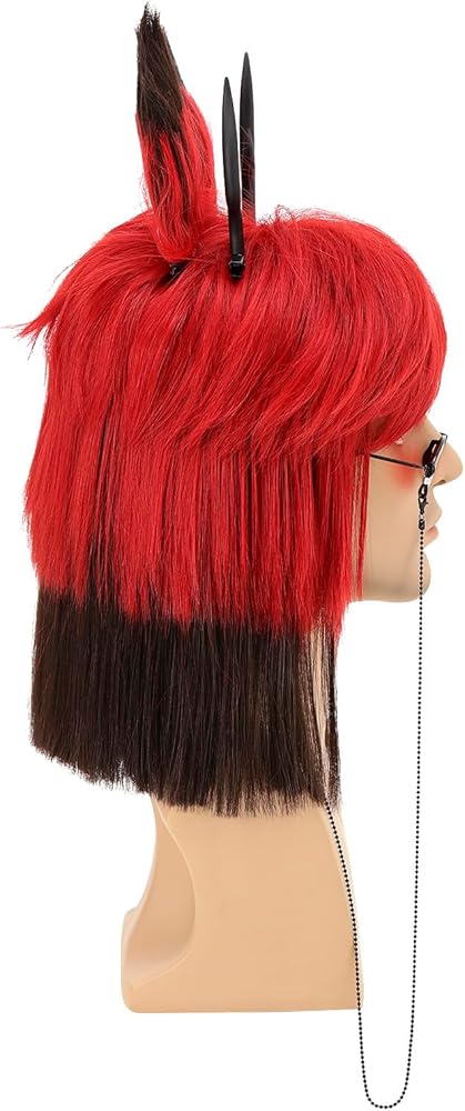 أنيمي الزي قصيرة للجنسين الأحمر والبني شعر مستعار تأثيري مع قرون الشيطان آذان قابلة للفصل أحادية حمراء مع سلسلة النظارات، شعر مستعار أحمر للرجال لحفلة تنكرية لحفلة الهالوين