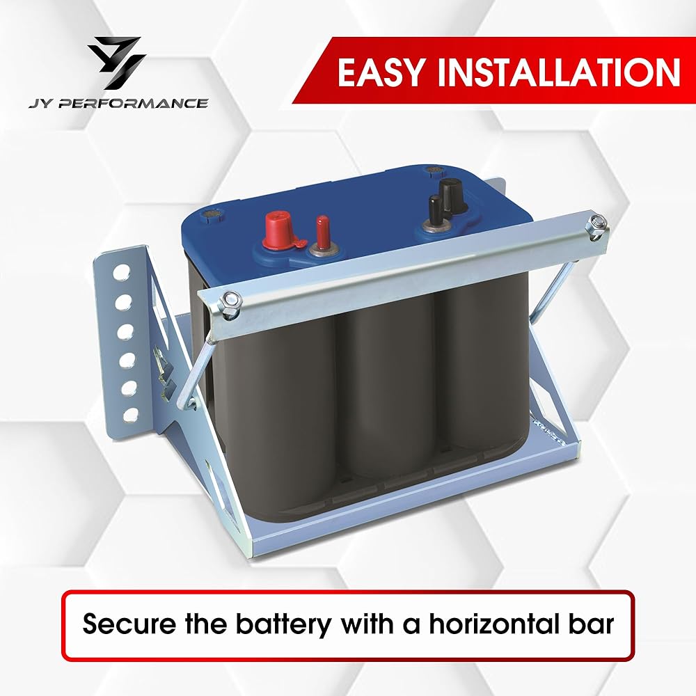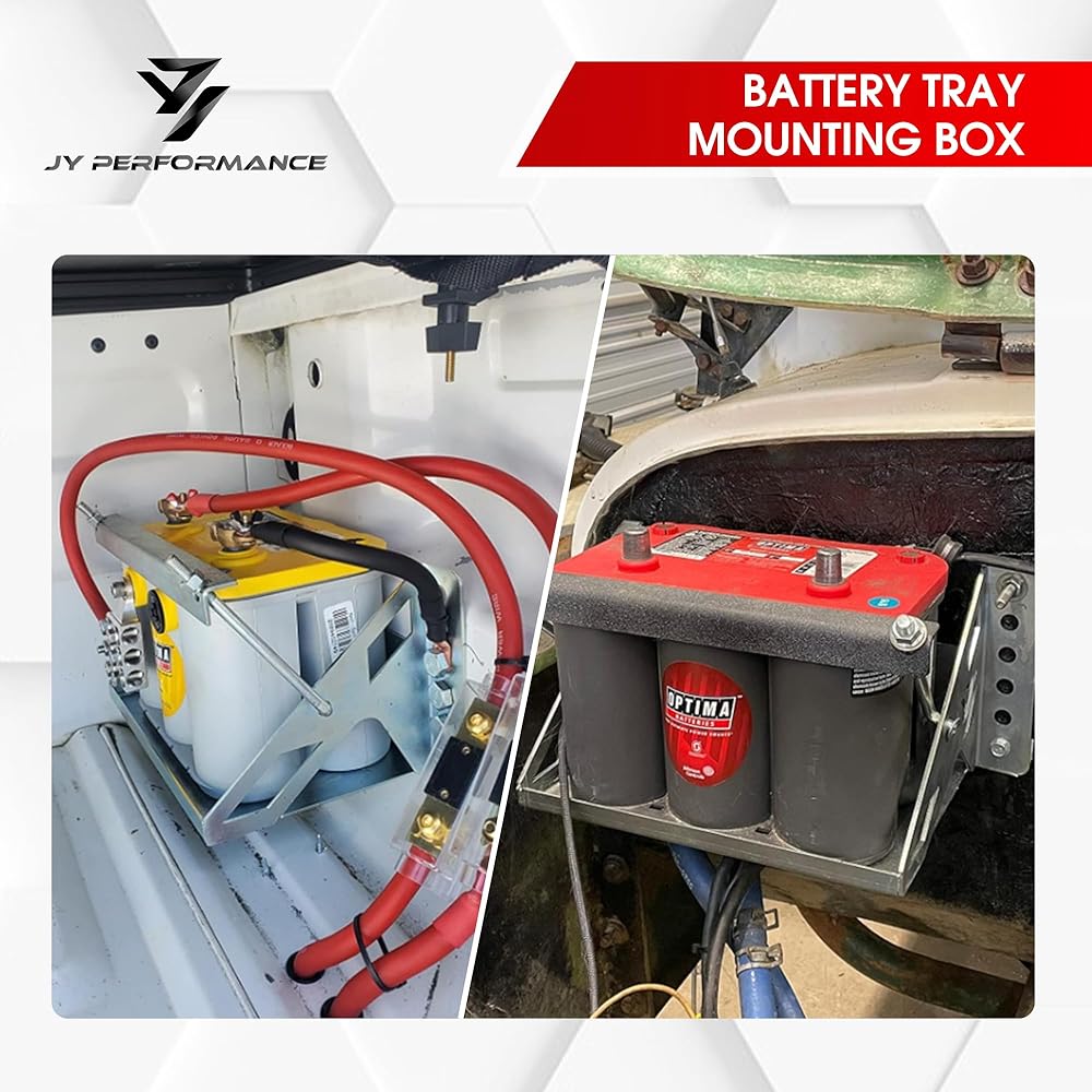 علبة بطارية فولاذية معدنية تناسب ما يصل إلى 10.63 بوصة طول × 7.06 بوصة عرض، وطول يصل إلى 7.5 بوصة، وتتضمن شريط زاوية تثبيت، ومسامير J مطلية بالزنك، وغسالات وصواميل نيلوك للحفاظ على البطارية مشدودة، بشكل عام الأبعاد: 14.38 بوصة طول × 7.25 بوصة عرض × 6.5 بوصة ارتفاع