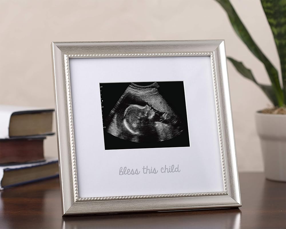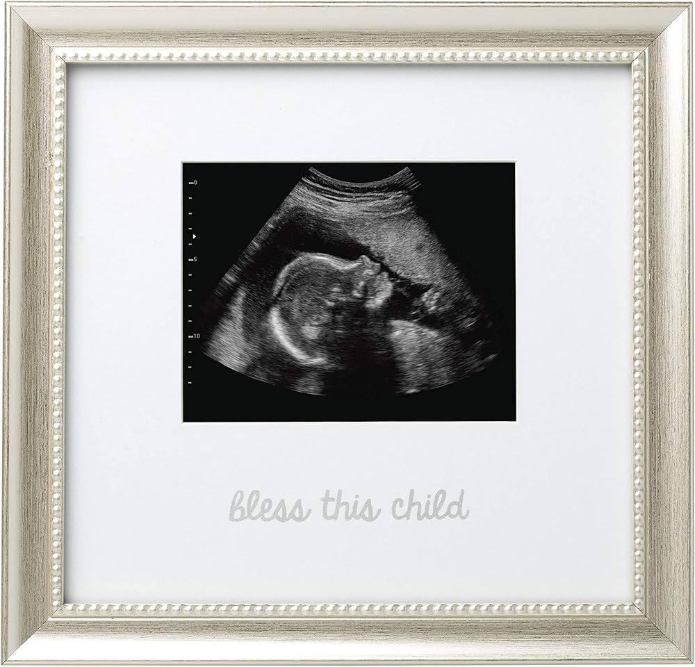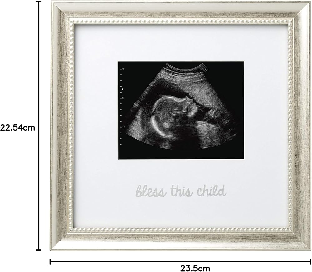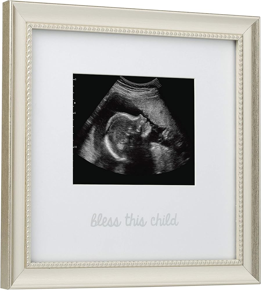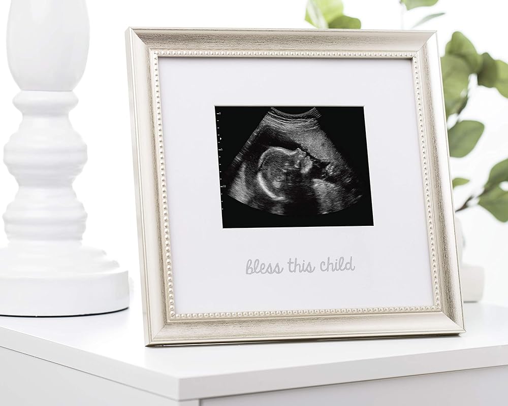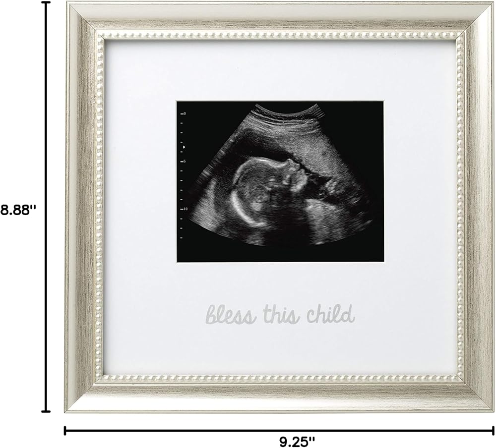 يتميز إطار الصورة بالموجات فوق الصوتية هذا بتفاصيل فضية كلاسيكية. مشاعر جميلة "Bless this Child" مطبوعة على الإطار، مما يجعل هذا الإطار إضافة مثالية لديكور غرفة الأطفال