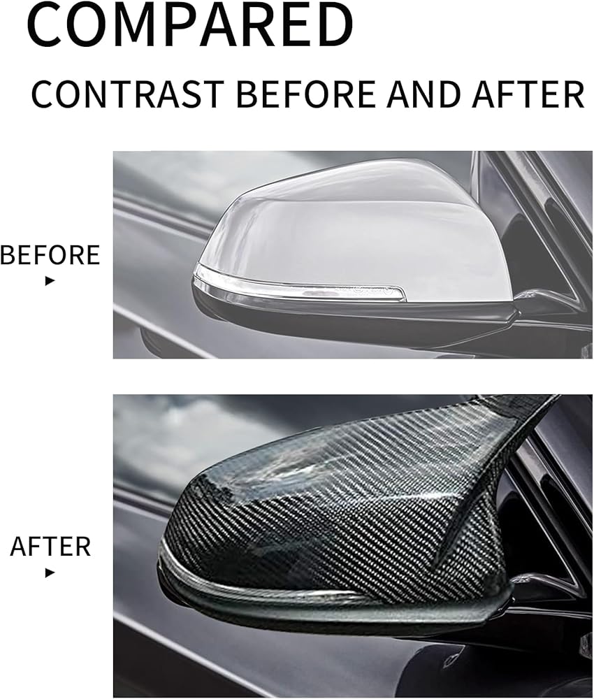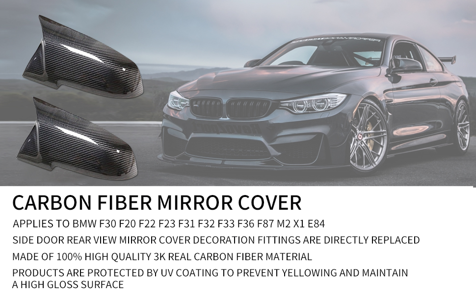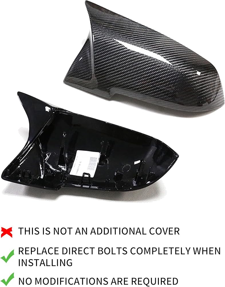 الإعداد: أغطية مرايا من ألياف الكربون متوافقة مع موديلات BMW بما في ذلك 320i، 328i، 330i، 335i، 420i، 428i، 435i، F20، F22، F23، F30، F31، F32، F33، F36، F87 M2، X1، وE84. استبدال غطاء المرآة.