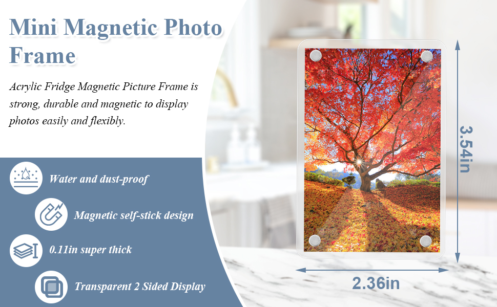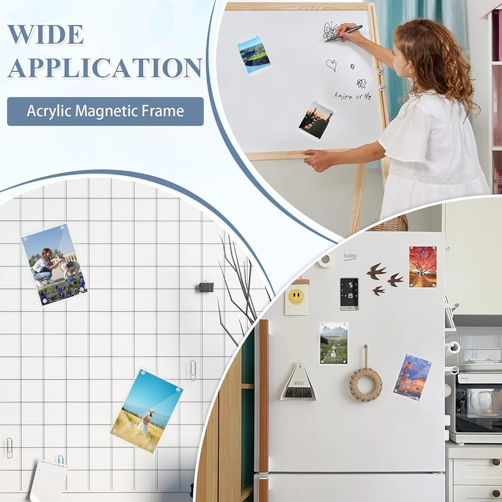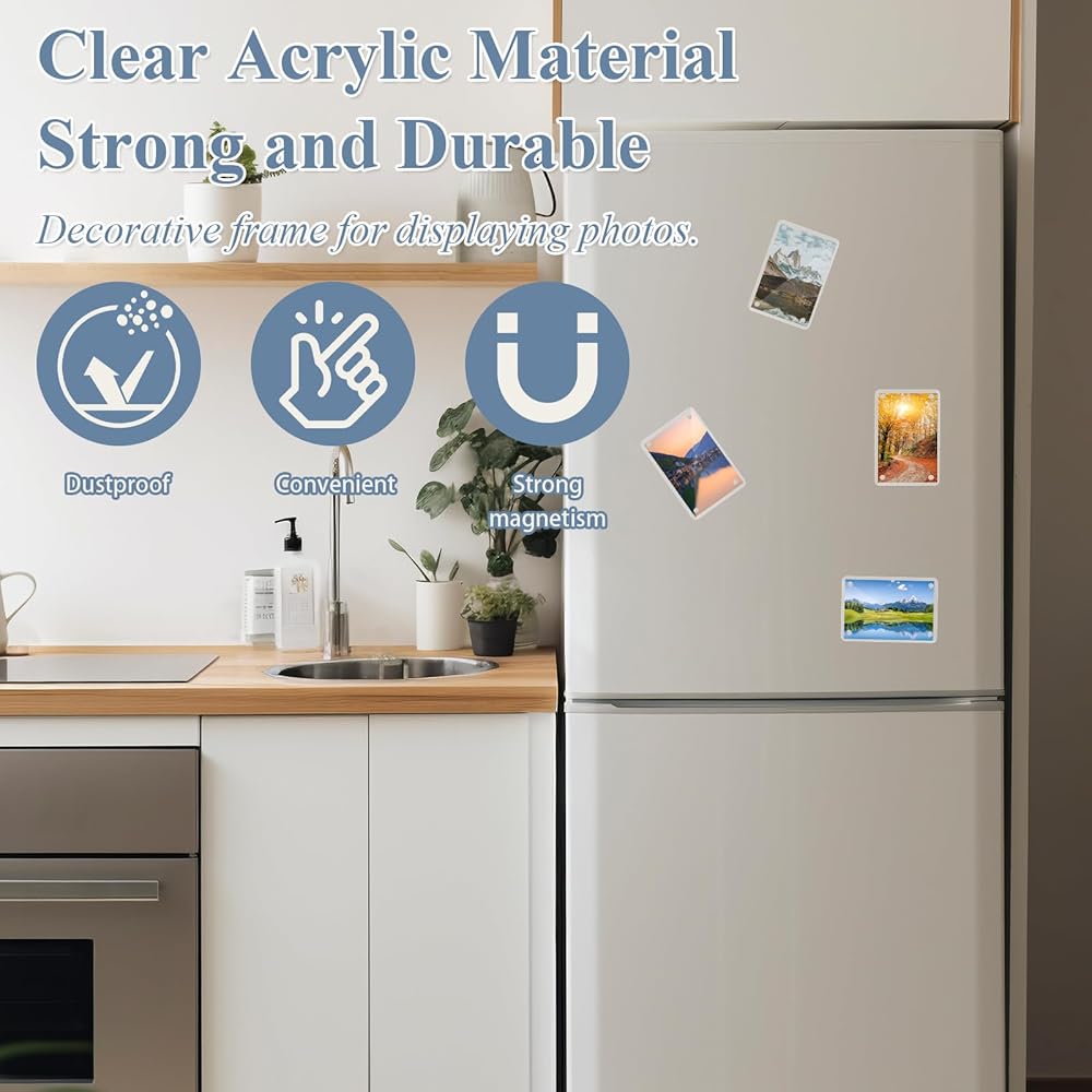 【آمن ومتين】بالمقارنة مع المواد الزجاجية التقليدية، يتمتع الأكريليك بأداء أفضل في مقاومة الصدمات والسقوط، حتى إذا سقط عن طريق الخطأ من باب الثلاجة، فليس من السهل كسره أو تلفه، كما أنه يتمتع بحماية ممتازة من الأشعة فوق البنفسجية، والتي يمكن أن قم بحماية الصور للحفاظ على اللون والملمس الأصليين لفترة طويلة.