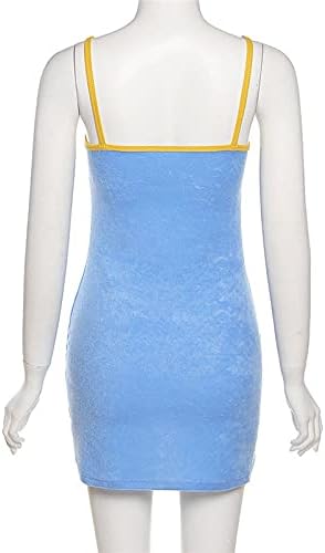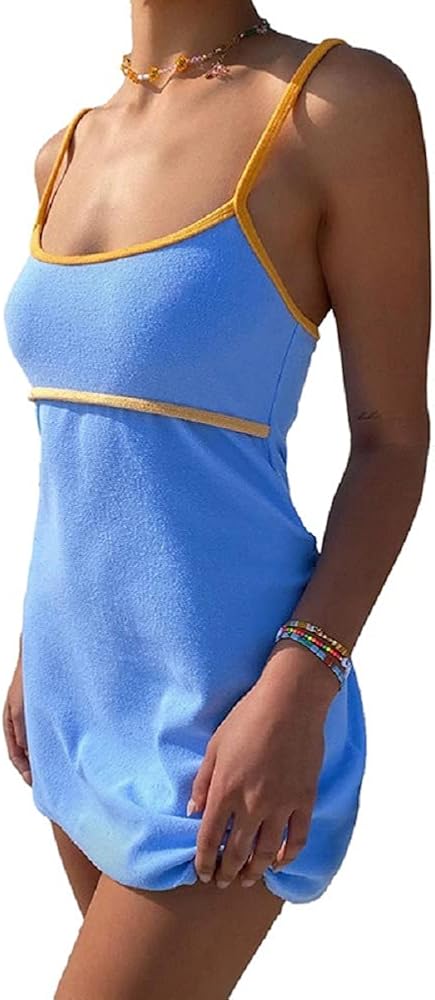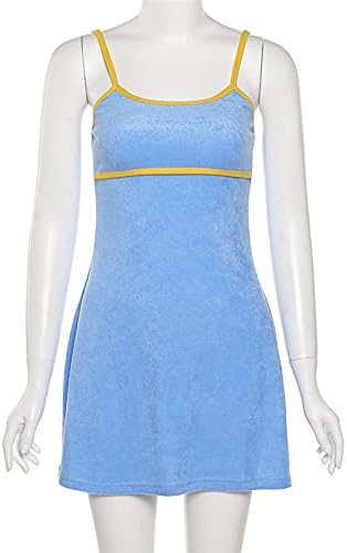 - المزايا: الفستان سهل الارتداء مزود بأشرطة سباغيتي، بدون أكمام، بدون ظهر، مرقع بألوان متباينة، على شكل حرف A، فوق طول الركبة.