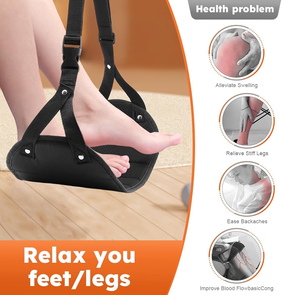 【PACKAGE CONTENT】You will receive 2pcs black airplane footrest hammocks, 2pcs footrest storage bags, 1pc black sleep eye cover and 1pair random color earplugs, suitable for men and women, intimate and practical set for your more comfortable travel experience.