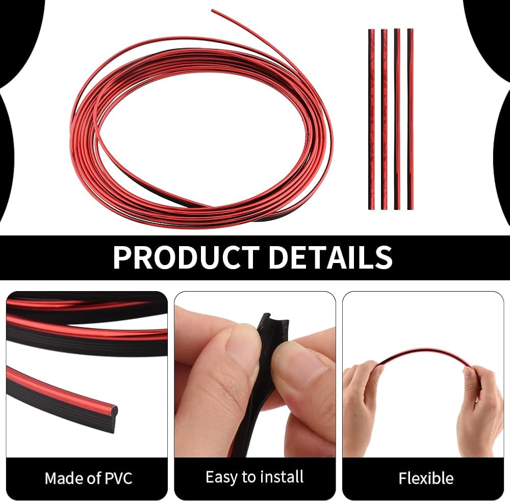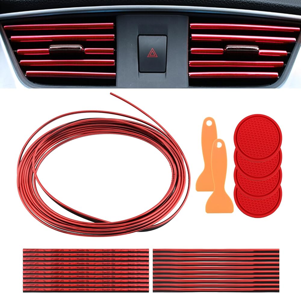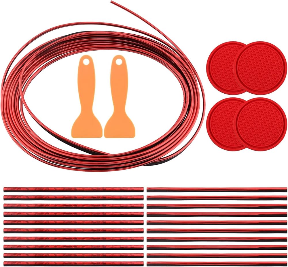 1.You will receive 1 roll 5m car trim strip, 20 pieces air vent interior trim strips, 4 pieces red cup holder mats for car and 2 pieces scraper. The quantity is sufficient enough and complete.