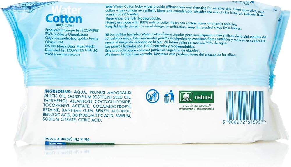 مناديل قطنية 100% ماصة ولها خصائص تنظيف جيدة جدًا. زيت اللوز الحلو وزيت بذرة القطن يرطبان بشرة الطفل بلطف. يمنع البانثينول والألانتوين التهيج