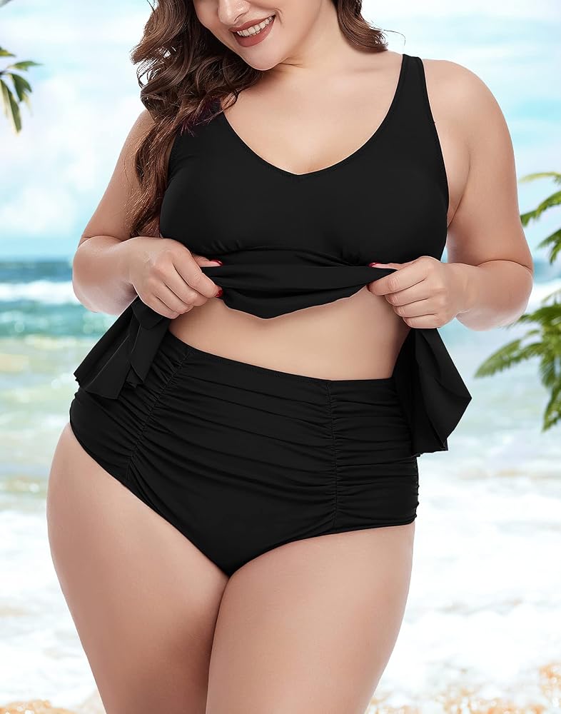بدلة سباحة تانكيني بمقاس كبير: تحتوي بدلة السباحة المكونة من قطعتين على جزء سفلي للسباحة عالي الخصر بتغطية كاملة، ويساعد على تغطية مناطق البطن، ومبطن بنعومة في المنطقة الأمامية ومريح على الجسم، وتغطية كاملة لتجنب الرؤية من خلاله، ومرونة عالية، واحتفاظ ممتاز بالشكل للحصول على مظهر جذاب.
