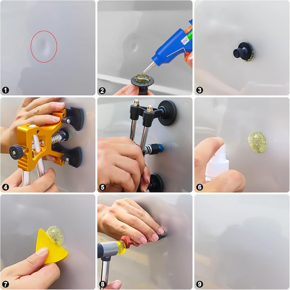 • 🚕 استخدام واسع النطاق - أداة سحب الانبعاجات مثالية لإزالة انبعاجات السيارة وإزالة الضربات الناتجة عن البرد. طقم إصلاح الانبعاجات بدون طلاء الخاص بنا مناسب لأي خدوش سيارات وإصلاح صدمات الأبواب وأضرار البرد والخدوش الأخرى. فعالة وآمنة لإزالة الخدوش وإصلاح قرع الباب وأضرار البرد على السطح المعدني، مثل السيارات والدراجات النارية والثلاجة والغسالة وما إلى ذلك. لا يوجد ضرر على الطلاء الأصلي. (نصيحة: هذه الأداة غير مناسبة للزوايا أو التجاعيد)