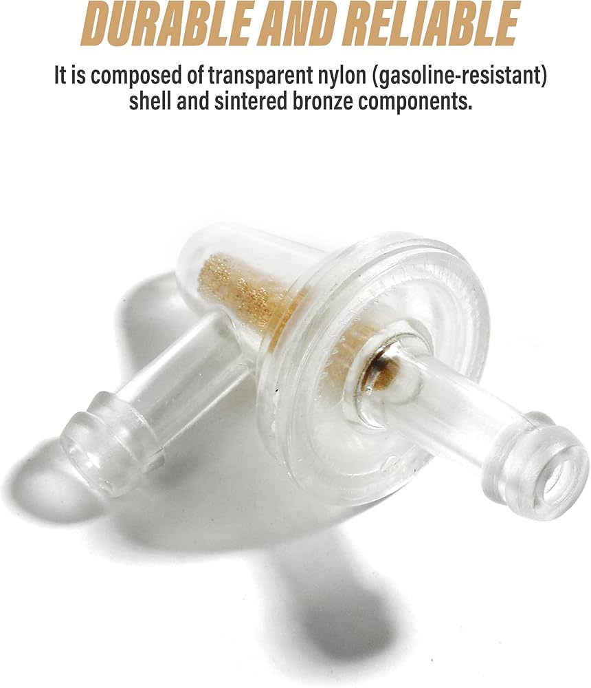 [Durable Material] The inline fuel filter is made of a transparent nylon (gasoline resistant) casing and sintered bronze components, which have high practicality and durability and are suitable for long-term use.