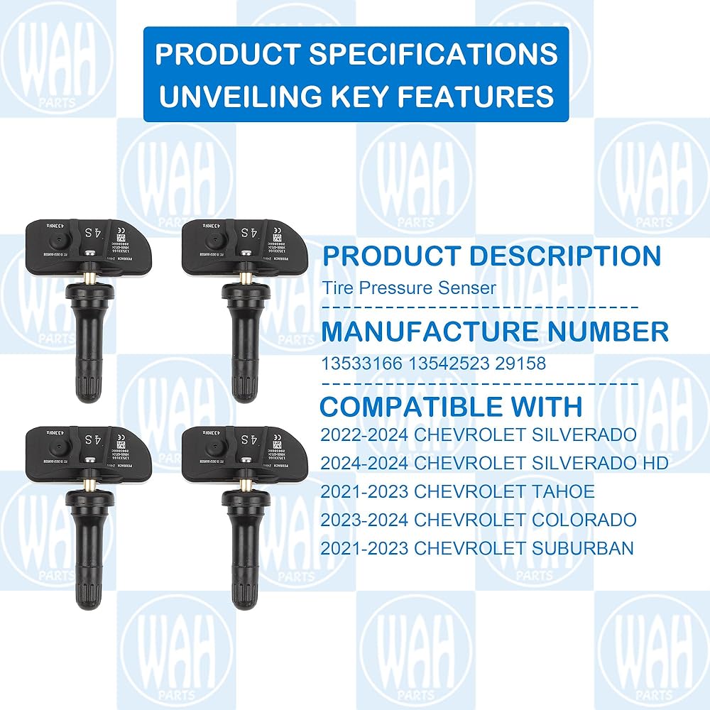 - مستشعر ضغط الإطارات متوافق مع شيفروليه: 2022-2024 شيفروليه سيلفرادو؛ 2024-2024 شيفروليه سيلفرادو HD؛ 2021-2023 شيفروليه تاهو؛ 2023-2024 شيفروليه كولورادو؛ 2021-2023 شيفروليه سوبربان
