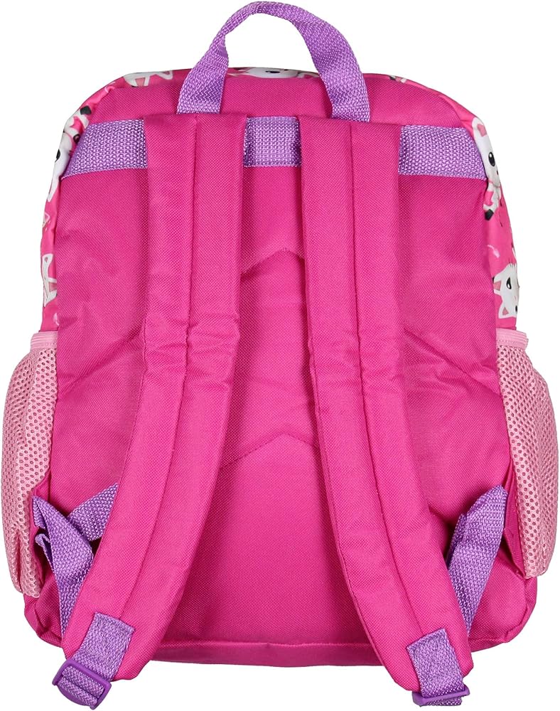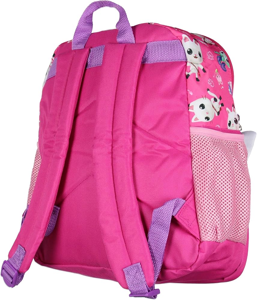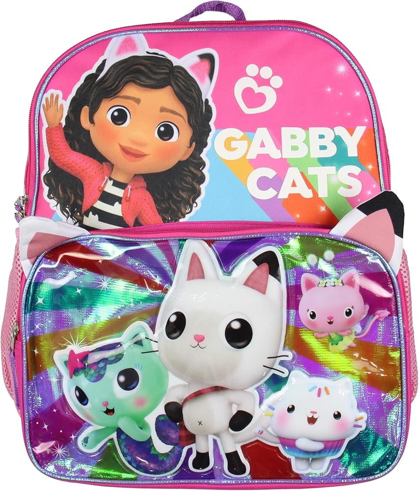 • Features—The front of the backpack showcases Gabby, with the text "Gabby Cats" on the upper portion. Gabby's cat friends Pandy, MerCat, and Cakey are featured on the lower pocket of the backpack in a raised design. The backpack has two main pockets and two water bottle side pockets. The lower pocket features cat ears that raise out of each corner of the pocket to match Gabby's iconic headband