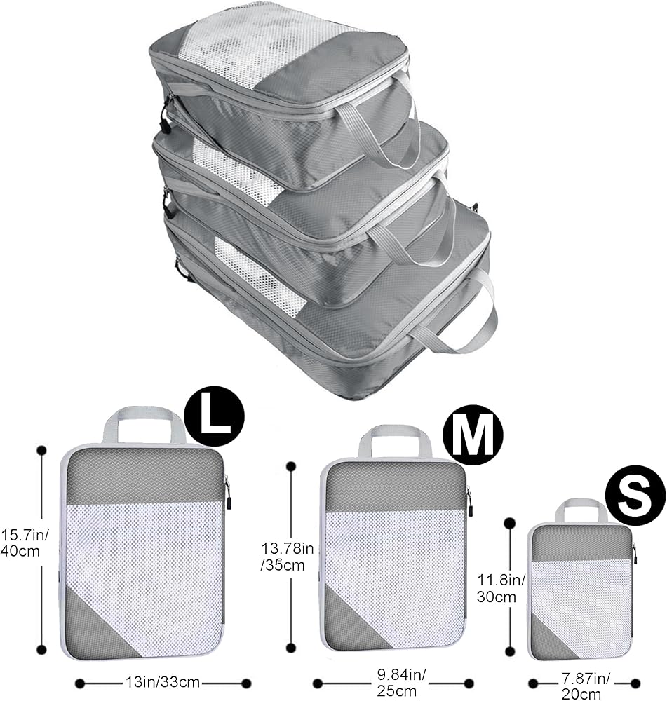 What Will You Get: 3-set compression packing cubes for travel include 1 large cubes (16''x12''x4''), 1 medium cubes (14''x10''x4''), 1 small cubes (12''x8''x4'')
