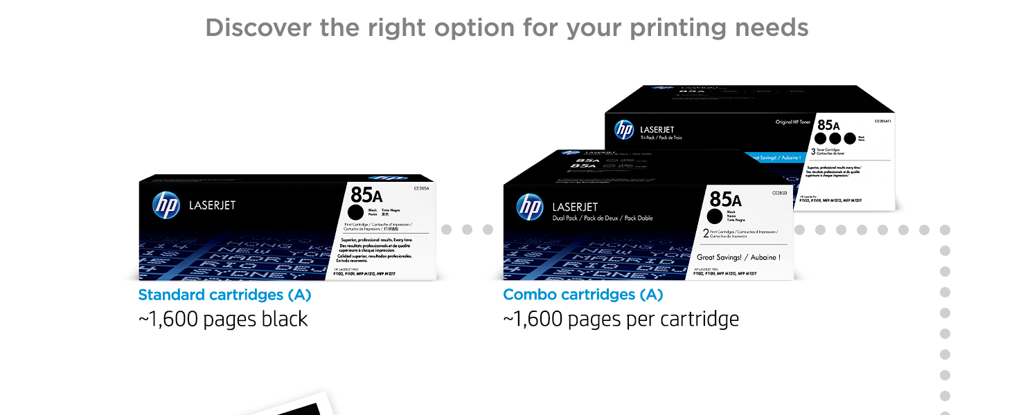 What's in the box: 1 new Original HP 85A Black Toner Cartridge (CE285A)