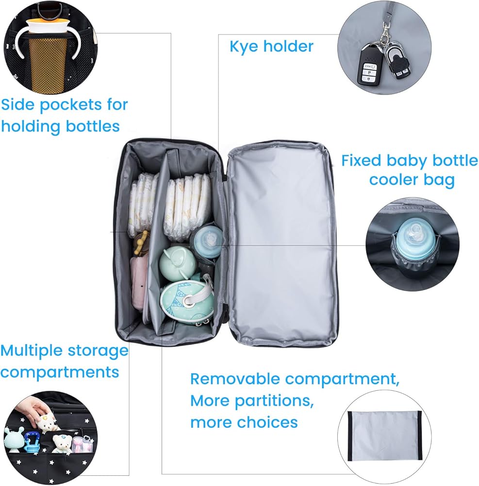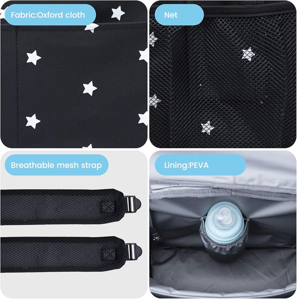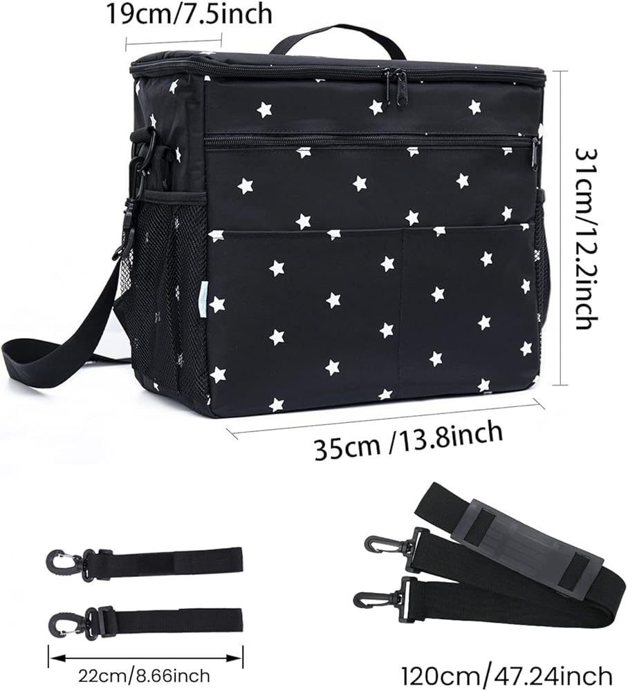👜 منظم عربة الأطفال ذو سعة كبيرة: 13.8 بوصة عرض × 12.2 بوصة طول × 7.5 بوصة عمق. تحتوي على الكثير من مساحات التخزين مع حجرة كبيرة للحفاضات أو المناديل المبللة أو الألعاب، وحامل زجاجات معزول، وحاملي أكواب شبكيين جانبيين، وجيب أمامي كبير، وجيبين أماميين صغيرين للهواتف.