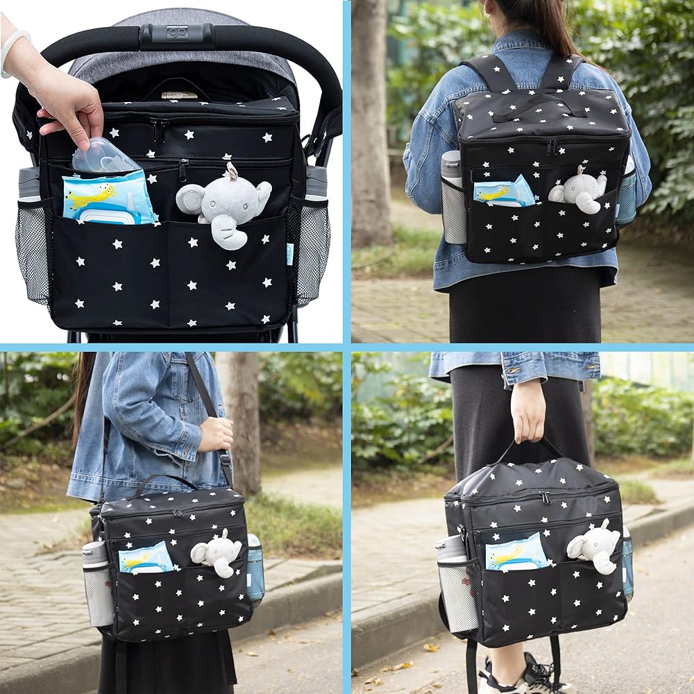منظم عربة الأطفال العالمي Orzbow XL، حقيبة حفاضات أطفال كبيرة مقاومة للماء، منظم علبة عربة الأطفال مع حامل أكواب وحزام كتف، 4 طرق لحمل حقيبة الظهر والكتف والرسول وحقيبة يد الأم (أسود)