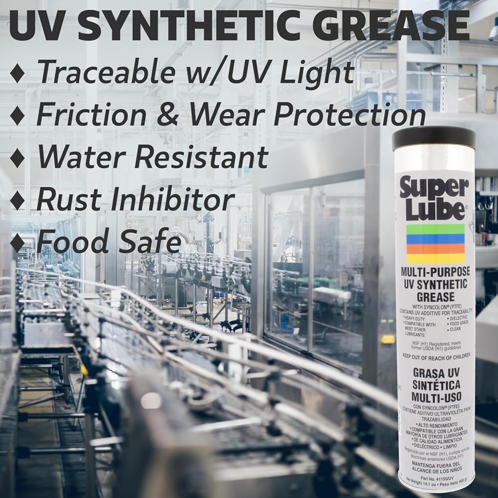 Super Lube® Grease is a patented synthetic heavy-duty, multi-purpose lubricant with Syncolon®. Synthetic base fluids and the addition of Syncolon® micro powders combine to form a premium lubricant that provides longer life protection against friction, wear, rust and corrosion. Machinery lasts longer, downtime is reduced and productivity is increased. Super Lube® Grease is a NSF registered Food Grade lubricant, rated H1 for incidental food contact. Meets former USDA (H1) guidelines. Super Lube® Grease offers good mechanical stability, does not evaporate or form gummy deposits. It will not melt or separate. There is no Silicone in Super Lube® Multi-Purpose Grease with Syncolon®. It is safe for use in paint spraying and finishing operations. UV additive for traceability – validates the existence of the lubricant.