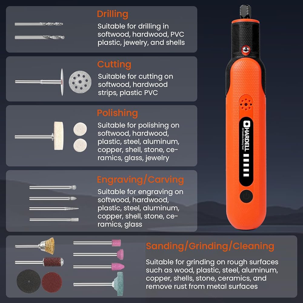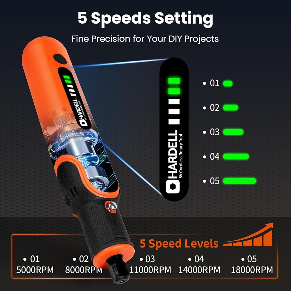 مجموعة أدوات دوارة هارديل 8 فولت لاسلكية مع 65 قطعة ملحقات، أداة دوارة كهربائية بـ 5 سرعات متغيرة، بطارية قابلة لإعادة الشحن، شحن من النوع C، للطحن والحفر والقطع والصنفرة والنحت والتلميع وما إلى ذلك