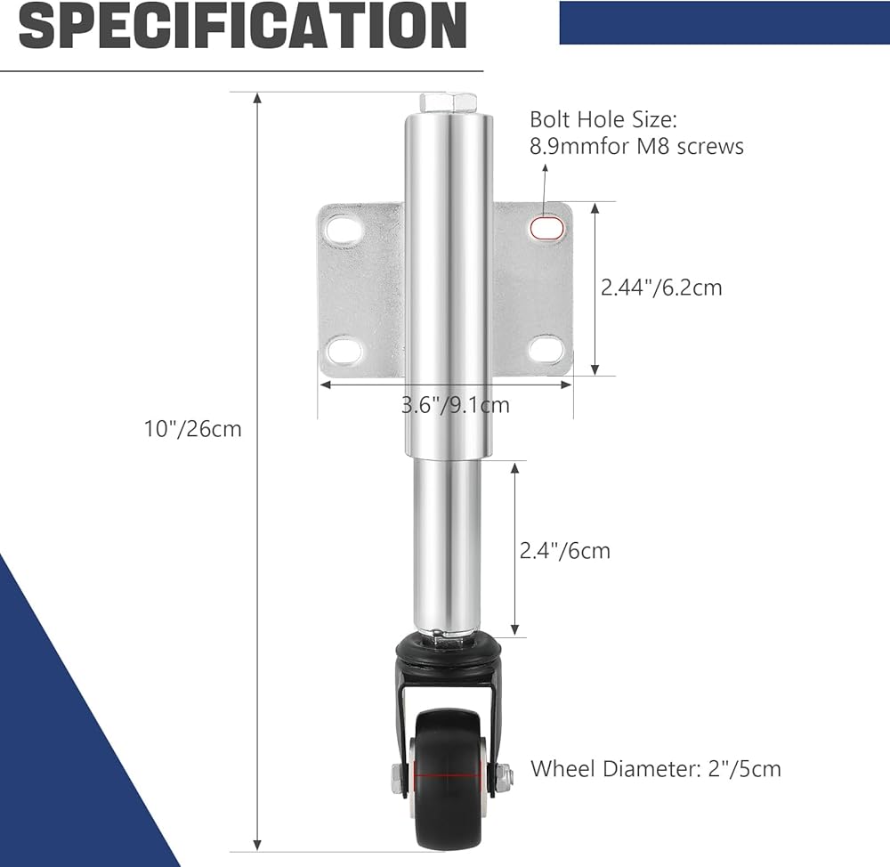 المواصفات: الارتفاع الإجمالي 10 بوصة/260 مم، قطر العجلة 2 بوصة/50 مم، مسافة فتحات التثبيت 2.95 بوصة طول × 1.77 عرض، الطول القابل للسحب 2.55 بوصة؛ حجم ثقب الترباس: 8.9 مللي متر لمسامير M8. سعة تحميل العجلات: 100 كجم/220 رطلاً؛ سعة تحميل الزنبرك: 50 كجم/110 رطل؛ أقصى سعة تحميل للعجلة: 50 كجم/110 رطل.