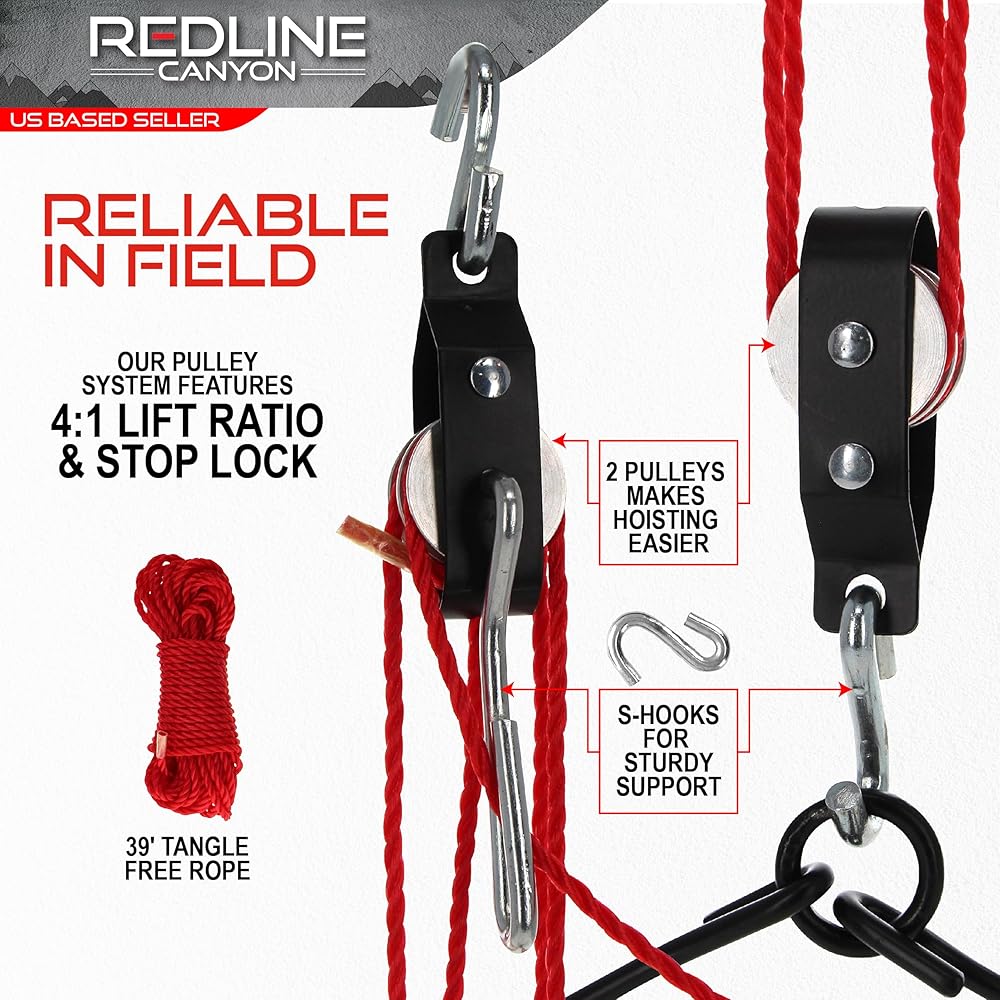 Say goodbye to the hassle of traditional game hanging methods and enjoy the convenience of our deer hoist pulley system. With effortless lifting capabilities, you can quickly hang and transport game with minimal exertion. The system offers versatile mounting options, allowing you to easily attach it to trees, poles, or other sturdy structures. Whether you're hunting in the woods, on the farm, or at a camp, you can quickly set up the hanger for efficient game processing. Its sturdy construction ensures long-lasting durability and reliable performance in any hunting environment. Our Pulley Lift System is lightweight and compact, making it easy to transport and store when not in use. Its portable design ensures hassle-free setup. Warning: This product can expose you to chemicals which is [are] known to the State of California to cause cancer and birth defects or other reproductive harm.