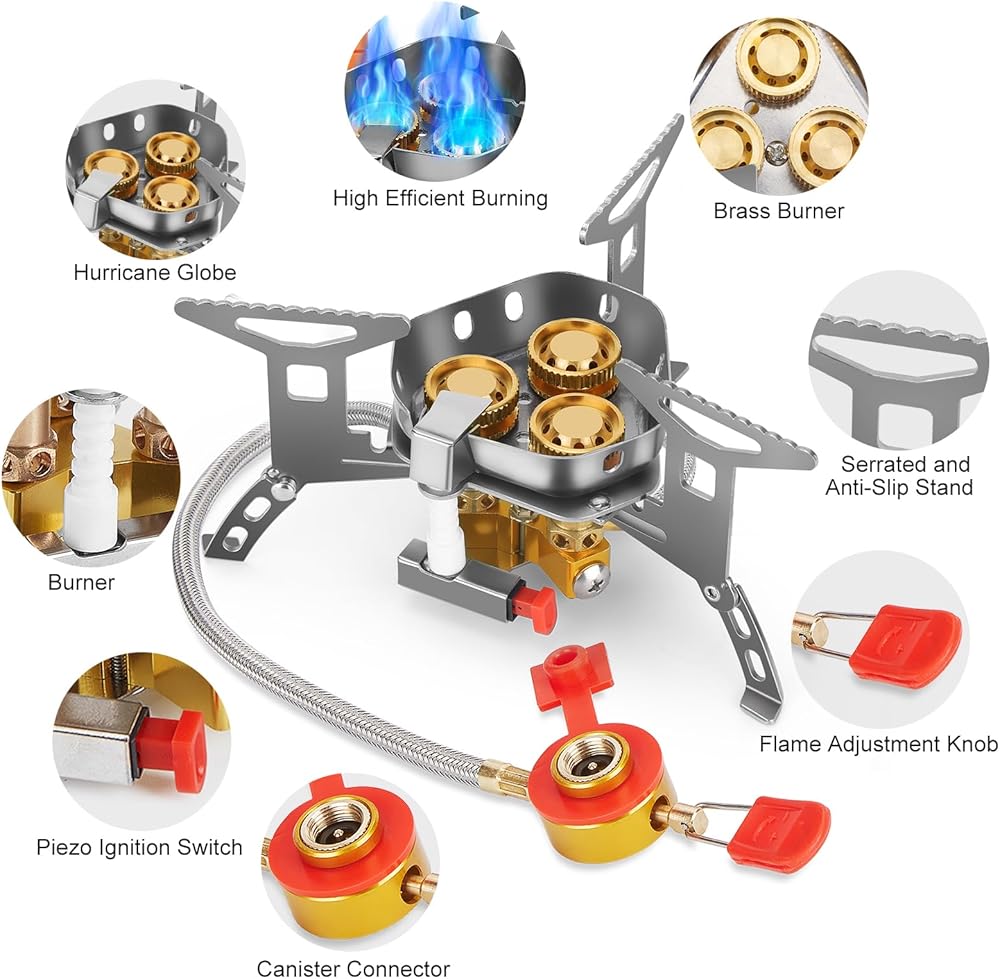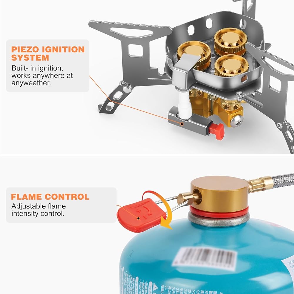• 🫕Upgraded Piezo Ignition and Flame control Knod: The ignition needle position plus a baffle so that it's easier to ignite the gas. The backpacking stove's flame control knod has a long handle, it is more convenient to adjust the flame size.