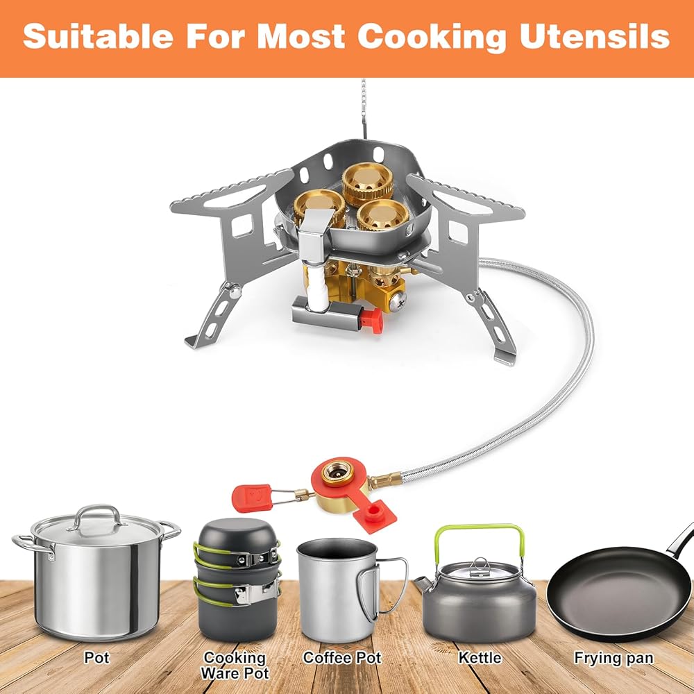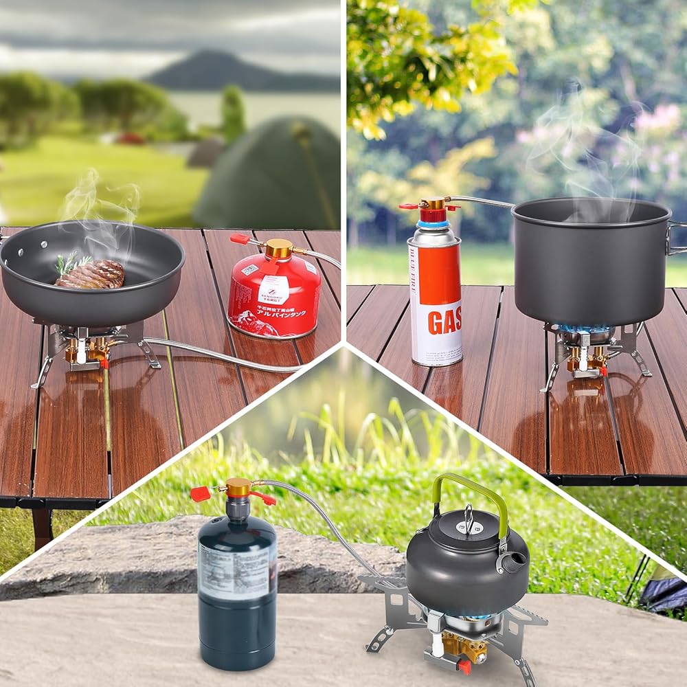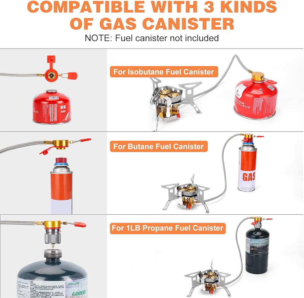 • 🚵Compatible with 3 Kinds of Gas Canister: Our backpacking stove is compatible with isobutane, butane and 1lb propane fuel canister. You can choose the appropriate adapter according to the needs. In addition, the hose of the camping stove is lengthened to 50cm, which is longer than other stove with only 30cm hose. The distance between the stove and the gas cylinder is farther and safer when using.