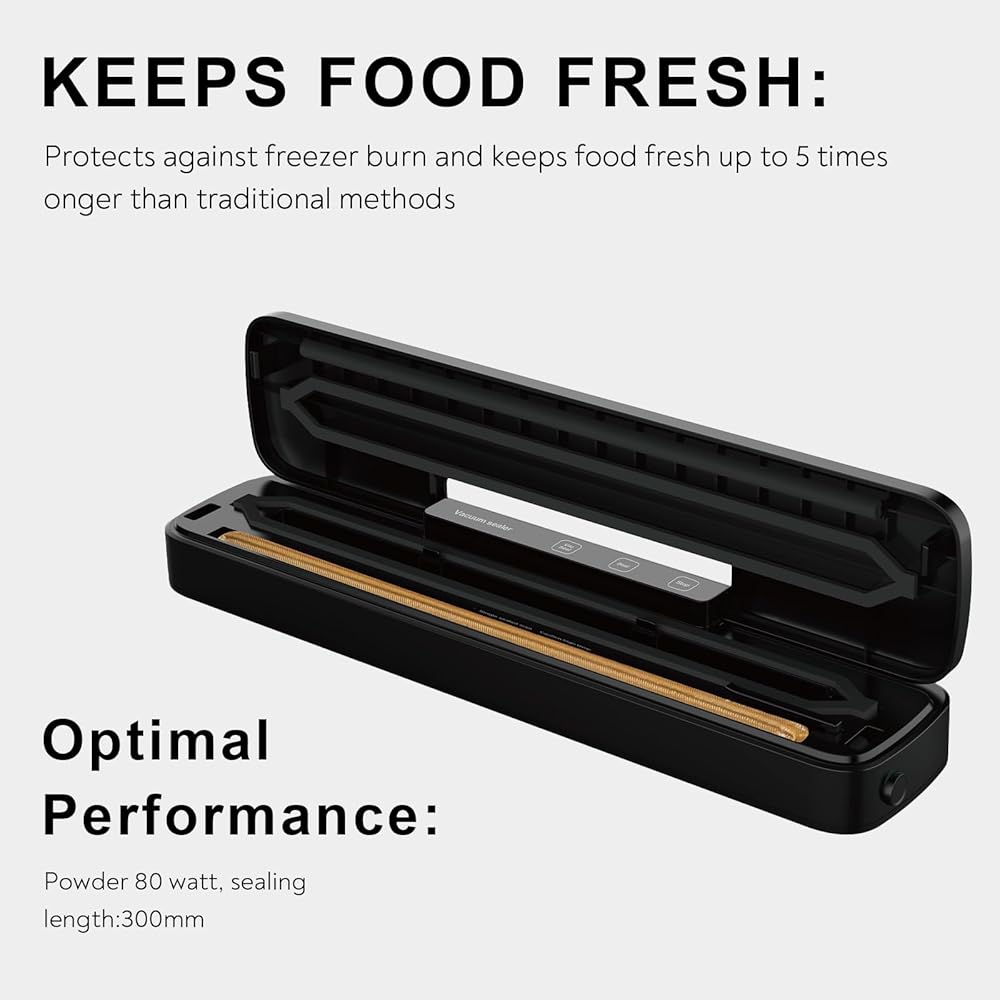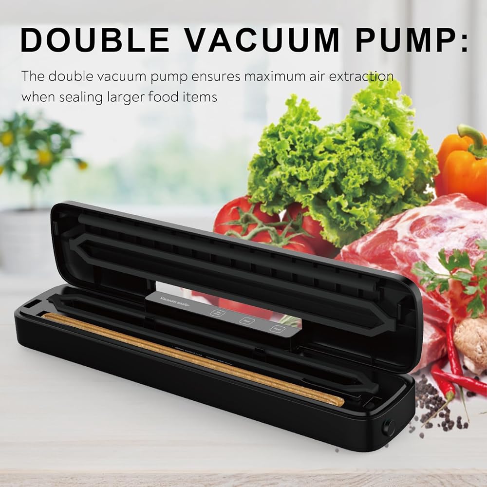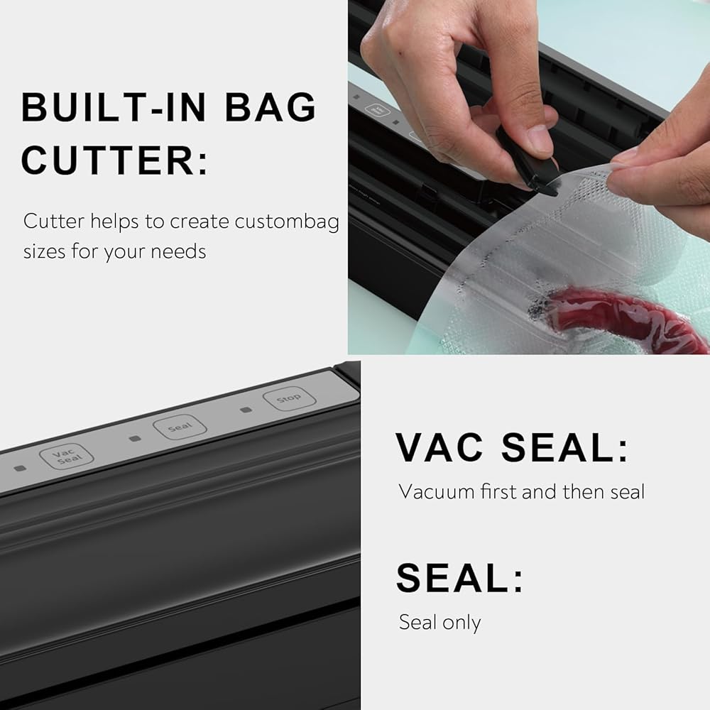 ختم فراغ فعال: تم تصميم آلة ختم الفراغ المدمجة الخاصة بنا لتوفير ختم فراغ فعال وموثوق لطعامك. بفضل قوة الشفط القوية، يمكنها إزالة الهواء من الأكياس بشكل فعال، مما يضمن نضارة محكمة الغلق وطويلة الأمد لمكوناتك