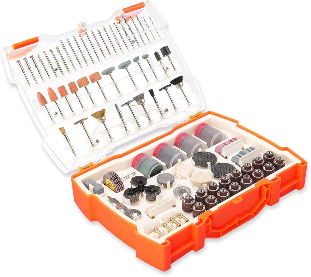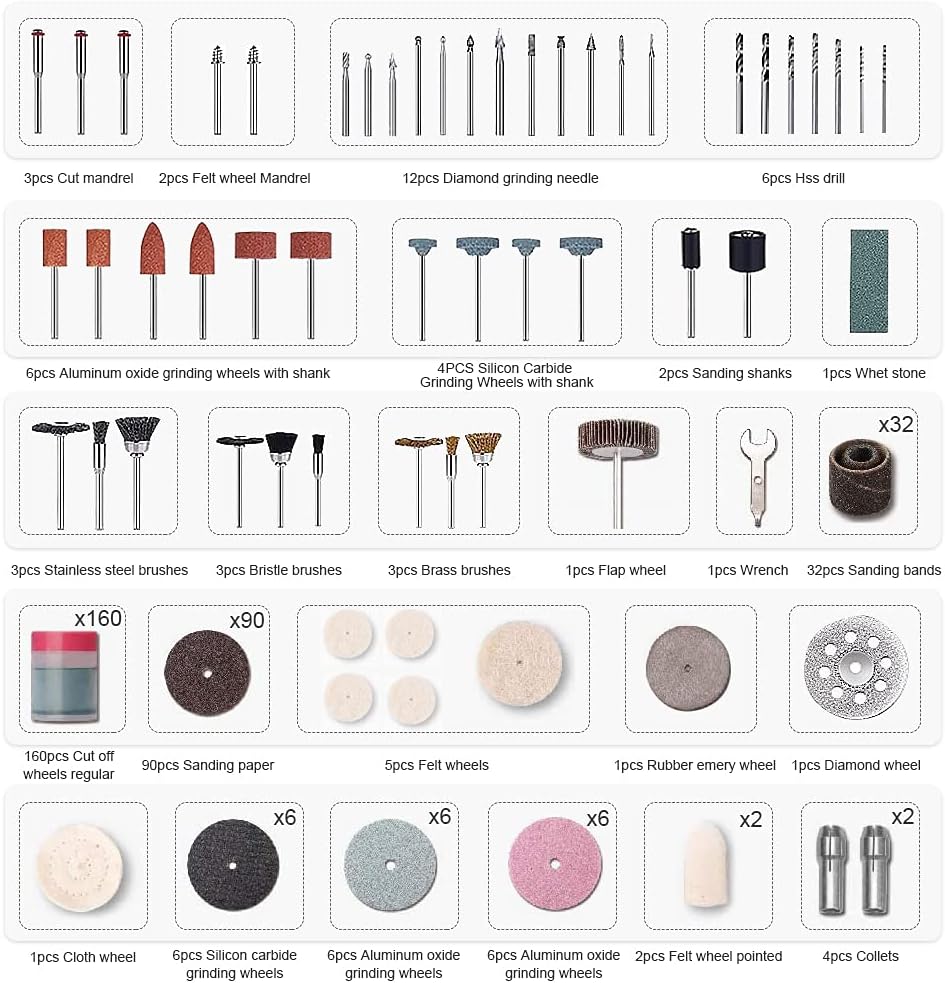 تتضمن مجموعة ملحقات الأدوات الدوارة هذه 3 فرش نحاسية، 3 فرش ذات شعيرات، 1 مغزل عجلة اللباد، 1 عجلة قماش، 3 فرش من الفولاذ المقاوم للصدأ، 1 عجلة رفرف، 5 عجلات لباد، 2 عجلة لباد مدببة، 10 إبر طحن ماسية، 3 قاطعة Hss، 12 عجلة طحن، 1 عجلة صنفرة مطاطية، 10 عجلات طحن مع ساق، 1 حجر شحذ، 4 أطواق، 1 مفتاح ربط، 1 عجلة ماسية، 3 مغزل قطع، 160 عجلات قطع عادية، 6 عجلات قطع من الألياف الزجاجية، 16 شريط سنفرة نحيف ، 16 شريط صنفرة، 90 ورق صنفرة، 2 ساق سنفرة، 6 مثقاب عالي الجودة