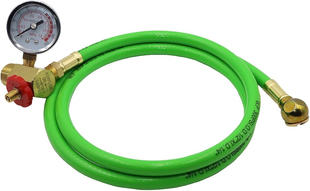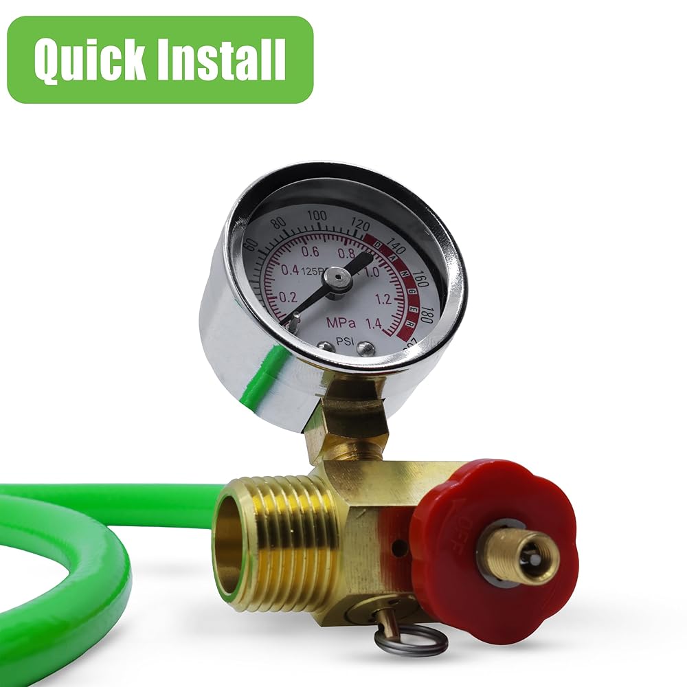 مجموعة تجميع خزان الهواء Grip - خرطوم هواء بطول 4 أقدام مع ظرف إطار 1/4 بوصة NPT، مشعب نحاسي، مقياس 0-200 رطل لكل بوصة مربعة - صمام تجاوز الأمان - تجاوز يدوي - ضبط الهواء تشغيل/إيقاف (PVC)