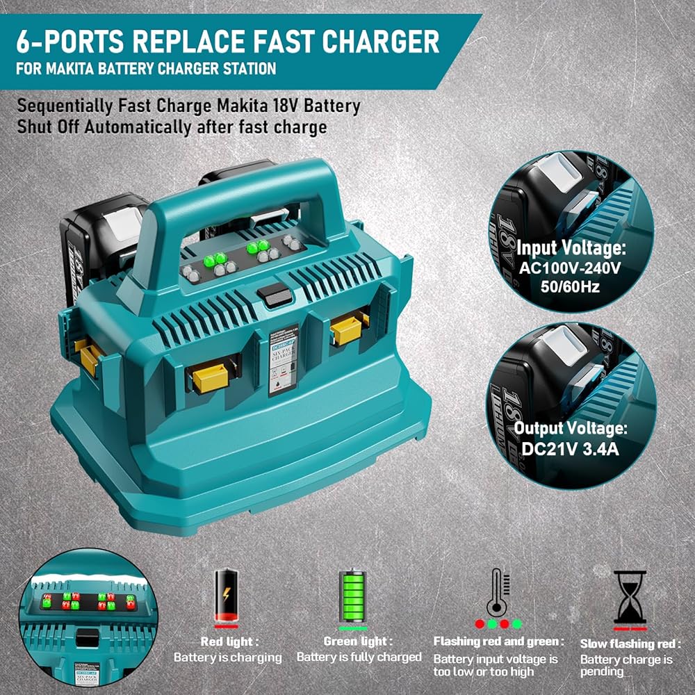 شاحن بطارية متسلسل 6 منافذ - استبدال محطة شحن 6 في 1 لشاحن بطارية ماكيتا، جهد الإدخال: AC100V-240V 50/60 هرتز، جهد الخرج: DC21V 3A. كل منفذ شحن مزود بمؤشر LED، يمكنك بسهولة معرفة حالة شحن البطارية. بديل رائع لشاحن ماكيتا السريع DC18RC DC18RD DC18RD، يشحن بسرعة مرضية، ويعمل بشكل جيد مثل طراز OEM.