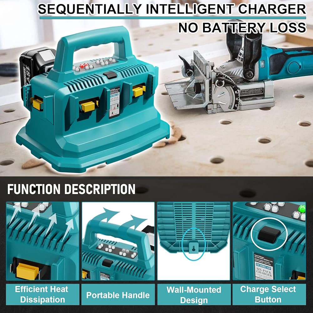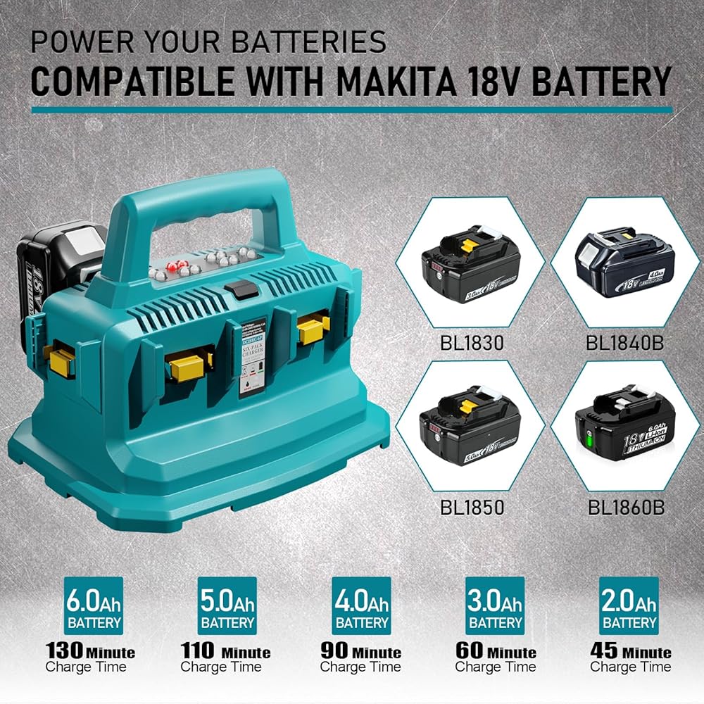 طاقة لبطارية ماكيتا 18 فولت - شاحن متسلسل لبطارية ماكيتا 18 فولت، متوافق بنسبة 100% مع بطارية ماكيتا 18 فولت BL1815 BL1830 BL1840 BL1845 BL1850 BL1860 إلخ. استبدال شاحن بطارية وحدة 6 في 1 لشاحن ماكيتا 18 فولت، شحن البطاريات بسرعة واستخدام منفذ واحد فقط . تعزيز سرعة الشحن، وتقليل وقت انتظار الشحن.