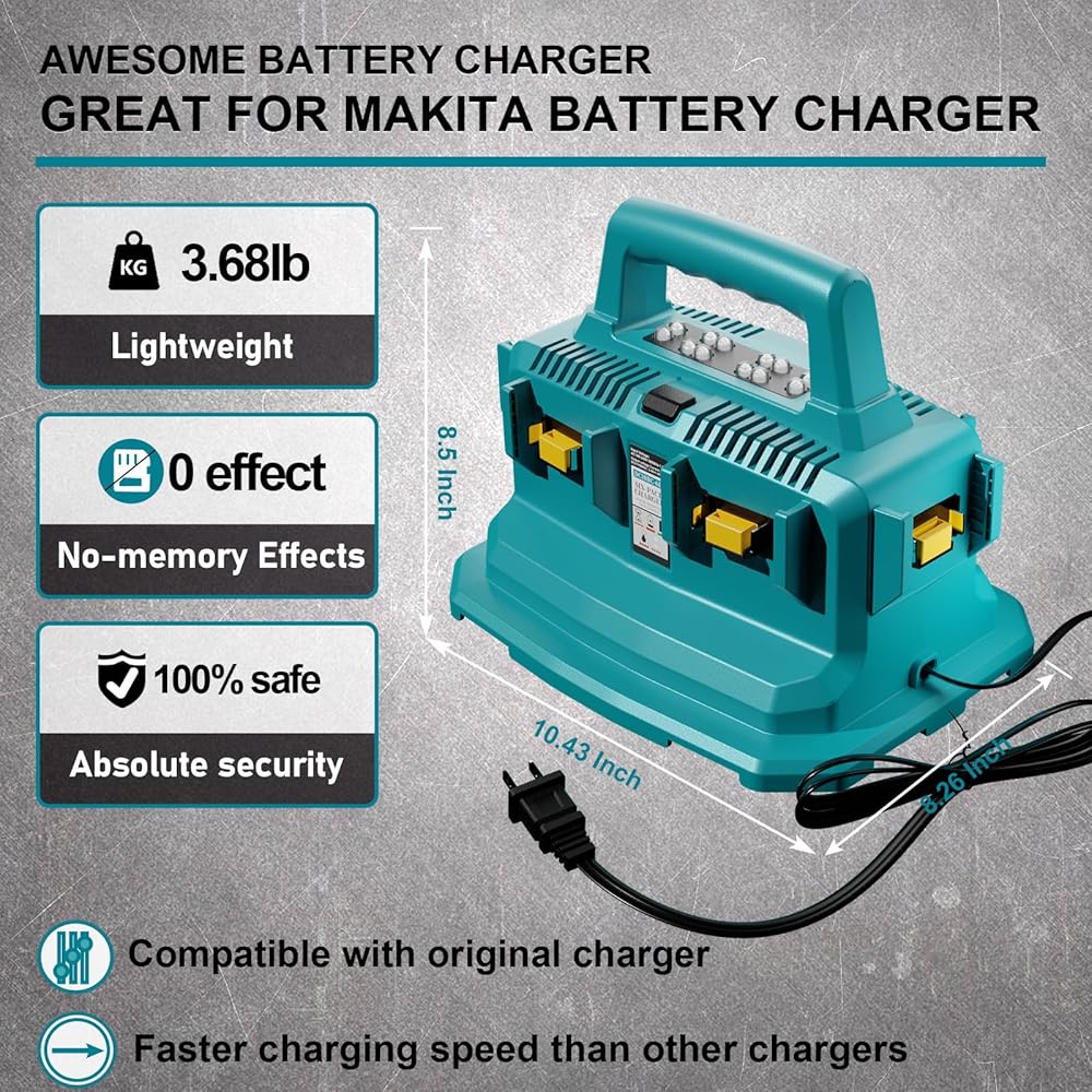 شاحن بطارية رائع - شاحن بطارية بديل لشاحن ماكيتا السريع، مصنوع من مادة سلكية سميكة ومقاومة للحريق. أدوات حماية مدمجة (رقاقة مدمجة وزعنفة تبريد) تراقب كل بطارية، ومضادة للسقوط ومتينة، ونظام حماية شحن ثابت، وآمن للشحن وإطالة عمر البطارية. 1.5 سنة!