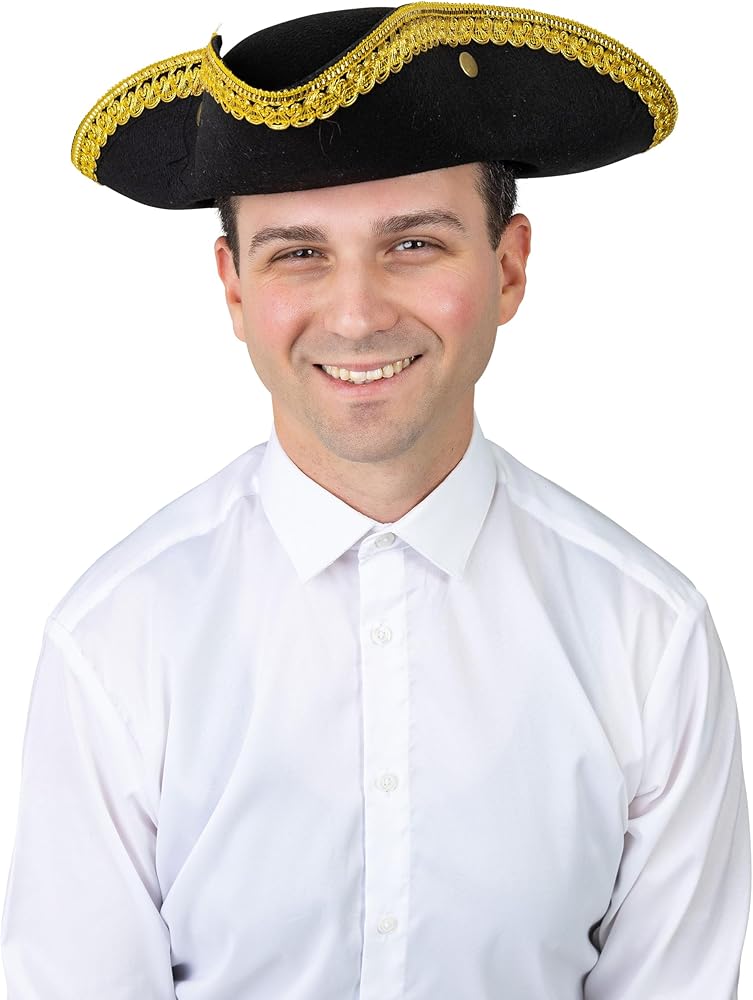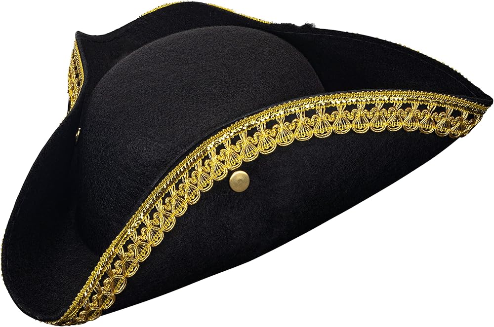 العودة إلى العصر - تم تصميم القبعة الاستعمارية السوداء ذات الطراز ثلاثي القرن التقليدي مع زخرفة ذهبية مفصلة. نظرة نبيلة حقيقية. تعتبر القبعة إكسسوارًا رائعًا لأي مناسبة.