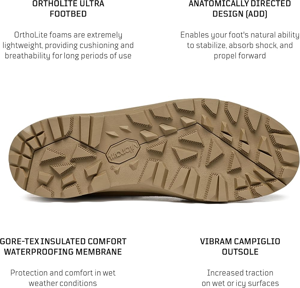 • متانة استثنائية: مصنوعة من جلد سويدي 1.8 ملم وحشوات من البوليستر، هذه الأحذية العسكرية للرجال والنساء توفر متانة ومرونة استثنائيتين، وتتحمل قسوة البيئات الصعبة. تتميز تقنية VIBRAM Traction Lug الموجودة على النعل الخارجي بوجود عروات مصممة خصيصًا للجر والإمساك على الأسطح الجليدية أو الزلقة.