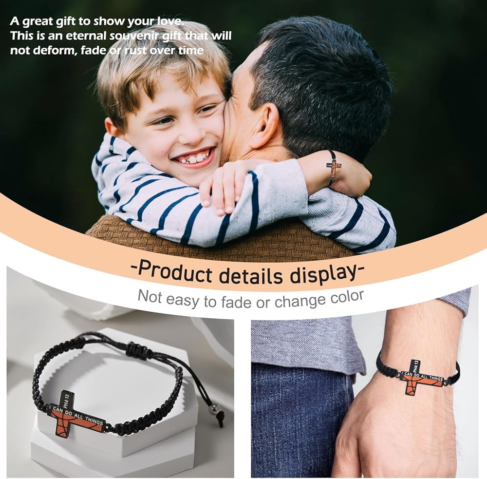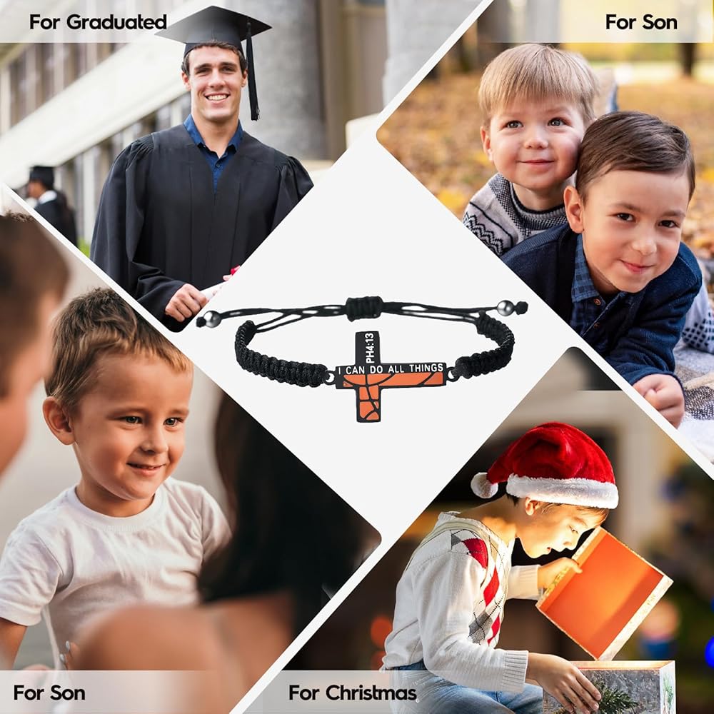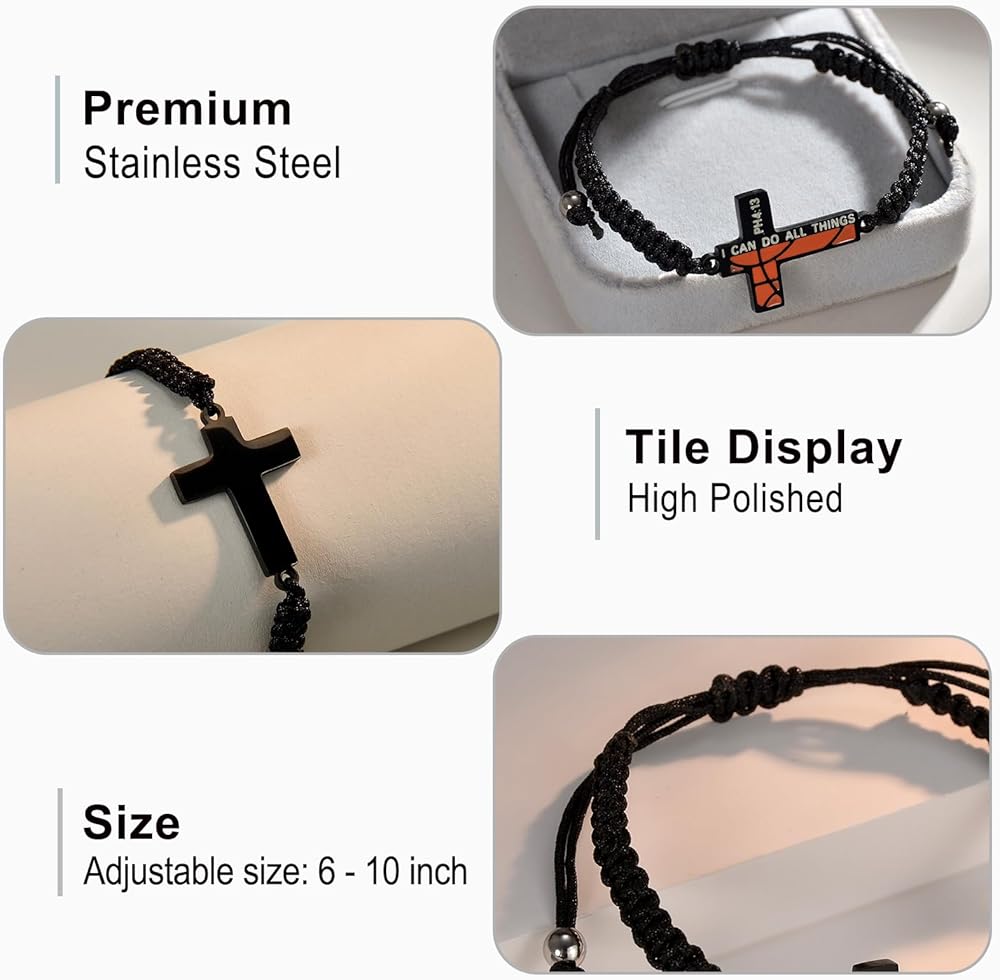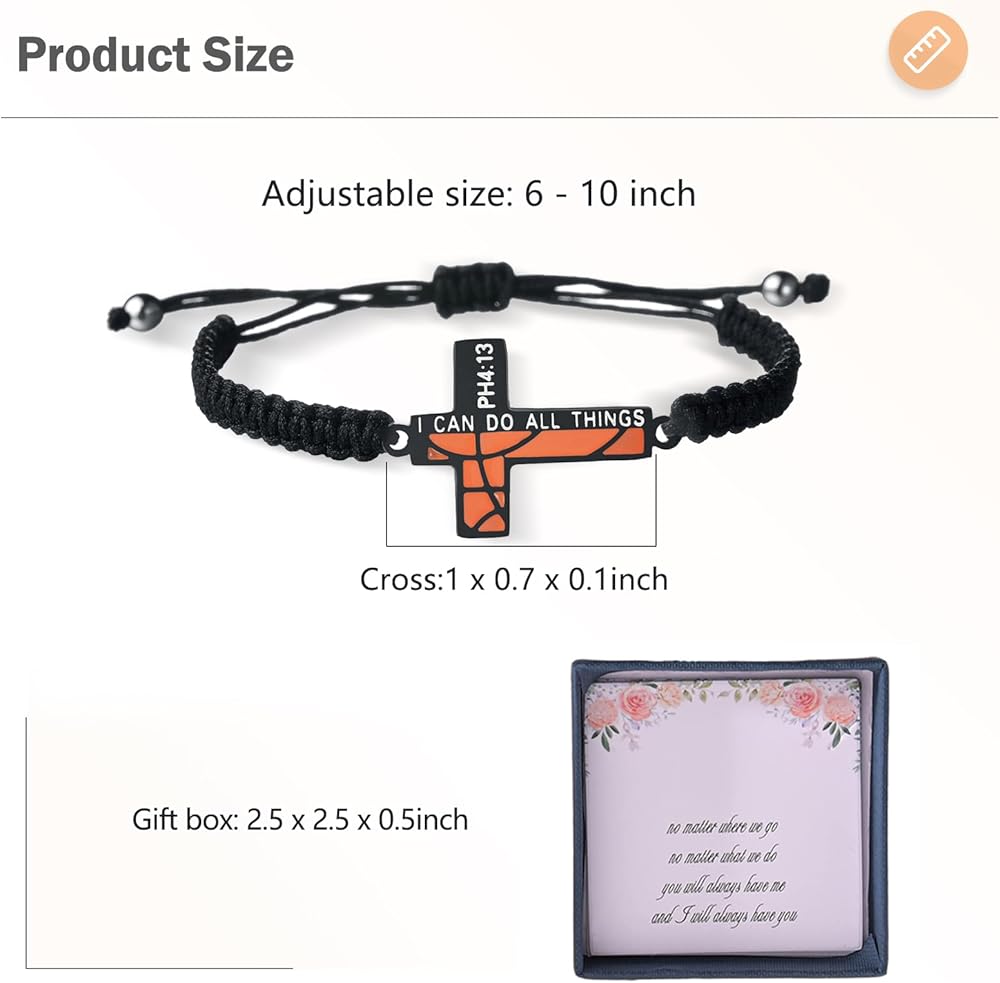• 【التصميم】قطعتان: سوار متقاطع لكرة السلة باللونين الأسود والفضي. الصليب مملوء بنمط كرة السلة. تصميم فريد يجمع بين آية الكتاب المقدس الملهمة من فيليبيان 4:13 "يمكنني أن أفعل كل الأشياء".
