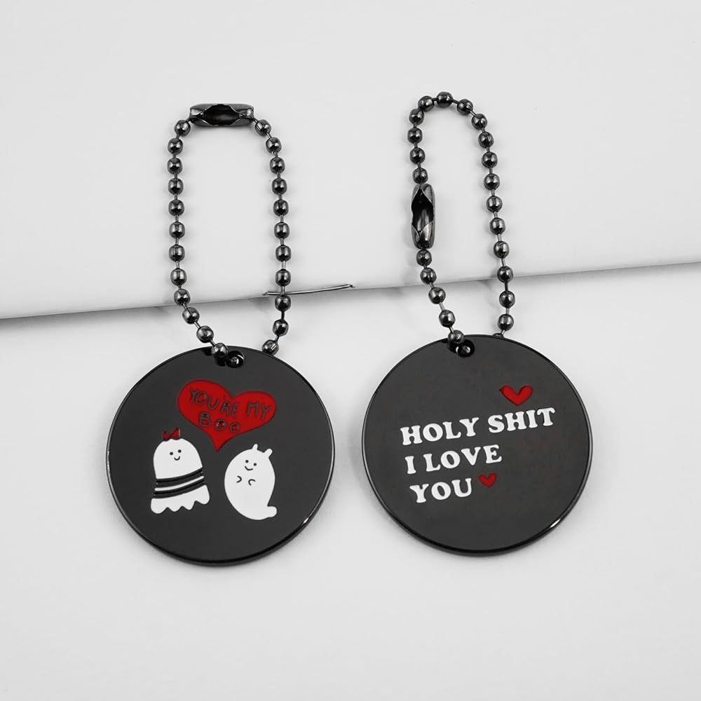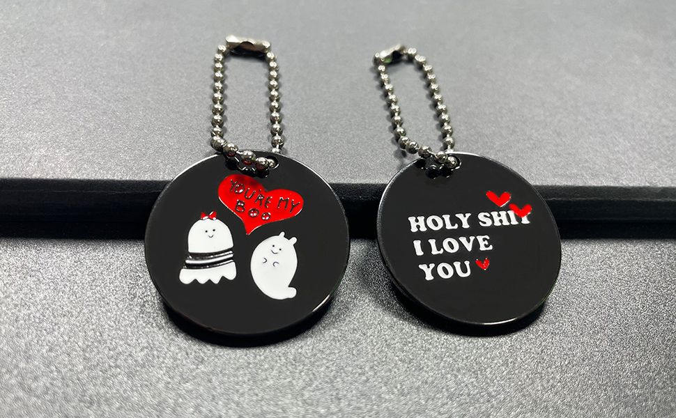 【العبوة】مجموعة من قطعتين، الحجم: القطر 1.18 بوصة، طول السلسلة: 3.9 بوصة، جانب واحد منقوش عليه "YOU'RE MY BOO" والجانب الآخر منقوش عليه "HOLY SHIT I LOVE YOU".