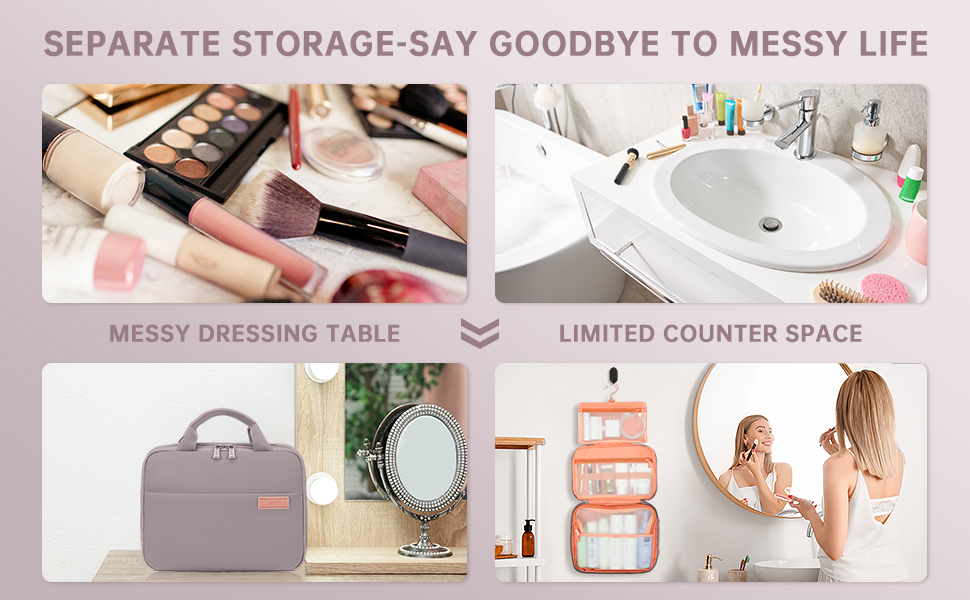 ابق منظمًا وسهل الحمل - يعتمد تصميم إغلاق بسحاب معدني مخصص في اتجاهين، مما يضمن الفتح والطي بسلاسة. حجرتان كبيرتان مقاومتان للماء مع فواصل وأشرطة مطاطية، وكلاهما يحافظ على الزجاجات والأشياء في وضع مستقيم ويمنع السوائل من الهروب أو الاصطدام بالزجاجات الأخرى، مما يحافظ على تنظيم حقيبة أدوات الزينة الخاصة بك. يوجد أيضًا جيب أمامي على الجزء الخارجي من حقيبة أدوات الزينة يوفر مساحة تخزين إضافية لسهولة الوصول إليها.
