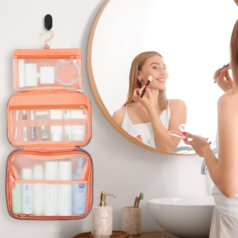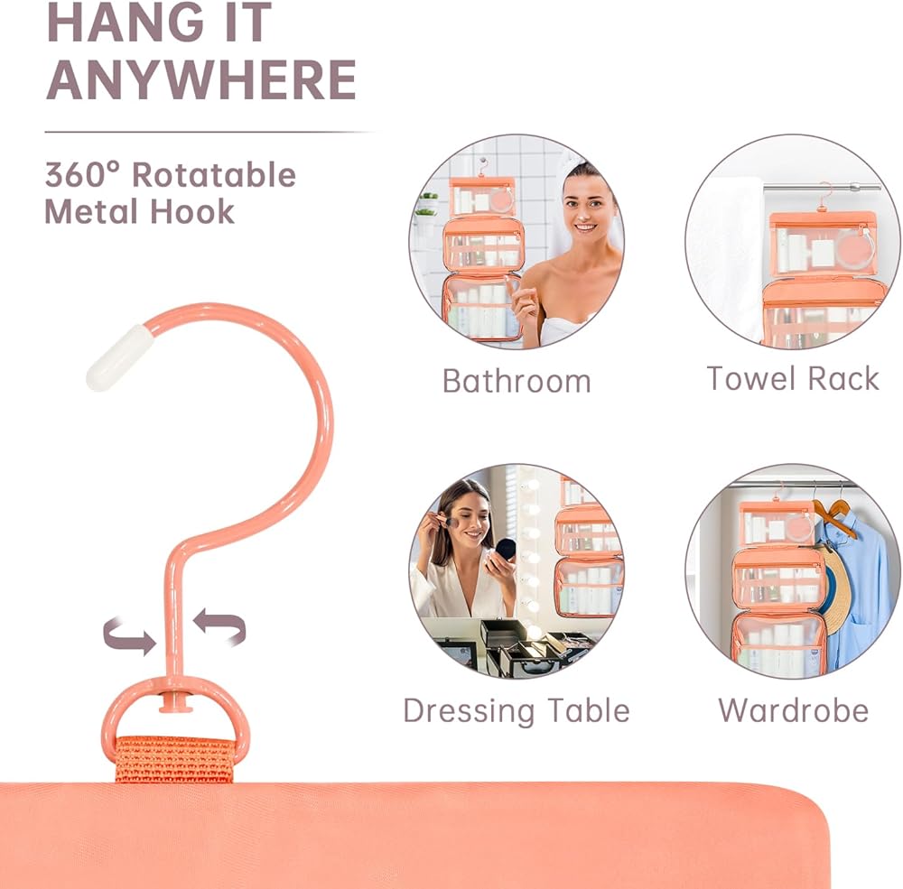 تصميم خطاف معدني قوي - يمكن لخطاف معدني غير قابل للانزلاق يدور 360 درجة تعليق حقيبة أدوات الزينة على رف المناشف أو رف المعطف أو أي مكان تحتاجه، بالإضافة إلى التصميم الشفاف يسمح بعرض مستحضرات التجميل ومستحضرات التجميل الخاصة بك بشكل جيد، ويوفر سهولة الوصول مع توفير الحمام. مساحة مضادة. مع حقيبة أدوات الزينة هذه، سيكون حوضك ومنضدة الزينة والمزيد خاليًا من الفوضى، مما يساعدك على أن تكون أكثر كفاءة وتوفر المزيد من الوقت.